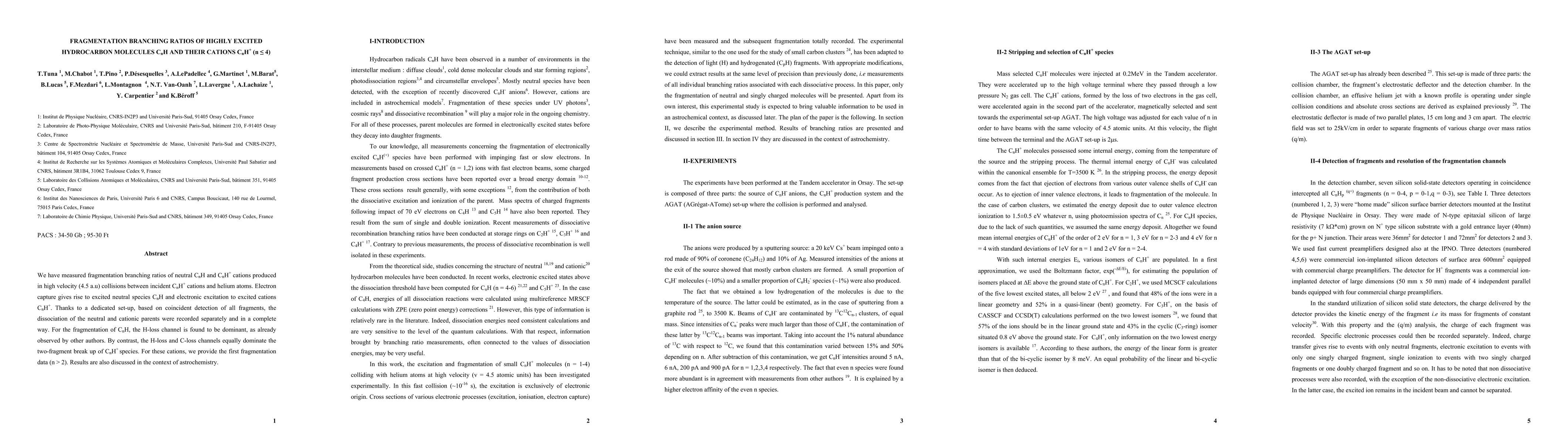 We have measured fragmentation branching ratios of neutral CnH and CnH+ cations produced in high velocity (4.5 a.u) collisions between incident CnH+ cations and helium atoms. Electron capture gives rise to excited neutral species CnH and electronic excitation to excited cations CnH+. Thanks to a dedicated set-up, based on coincident detection of all fragments, the dissociation of the neutral and cationic parents were recorded separately and in a complete way. For the fragmentation of CnH, the H-loss channel is found to be dominant, as already observed by other authors. By contrast, the H-loss and C-loss channels equally dominate the two-fragment break up of CnH+ species. For these cations, we provide the first fragmentation data (n > 2). Results are also discussed in the context of astrochemistry.