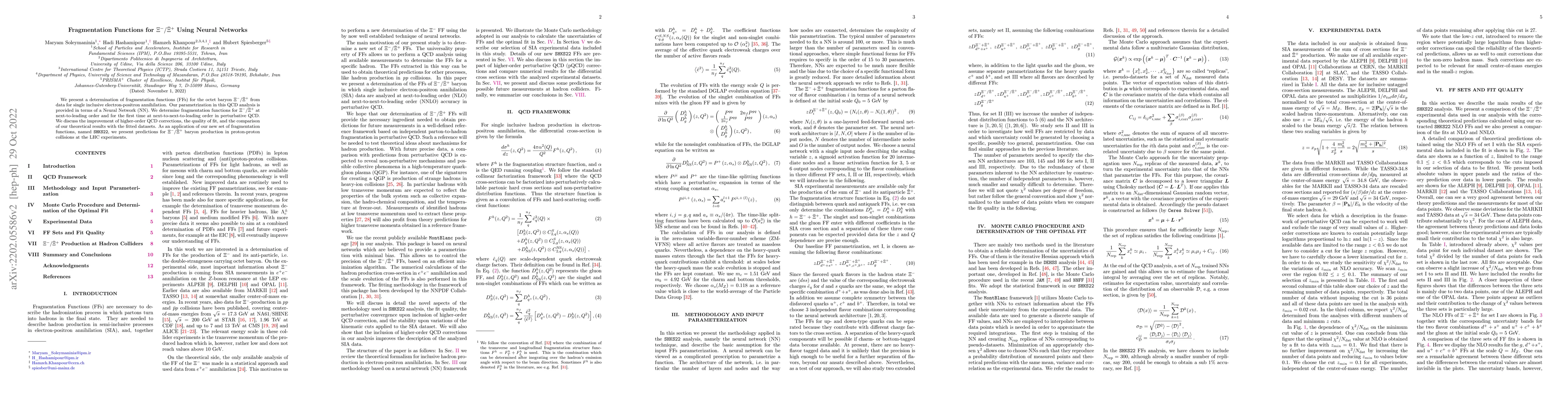 We present a determination of fragmentation functions (FFs) for the octet baryon $\Xi ^-/\bar{\Xi}^+$ from data for single inclusive electron-positron annihilation. Our parametrization in this QCD analysis is provided in terms of a Neural Network (NN). We determine fragmentation functions for $\Xi ^-/\bar{\Xi}^+$ at next-to-leading order and for the first time at next-to-next-to-leading order in perturbative QCD. We discuss the improvement of higher-order QCD corrections, the quality of fit, and the comparison of our theoretical results with the fitted datasets. As an application of our new set of fragmentation functions, named SHKS22, we present predictions for $\Xi ^- / \bar{\Xi}^+$ baryon production in proton-proton collisions at the LHC experiments.