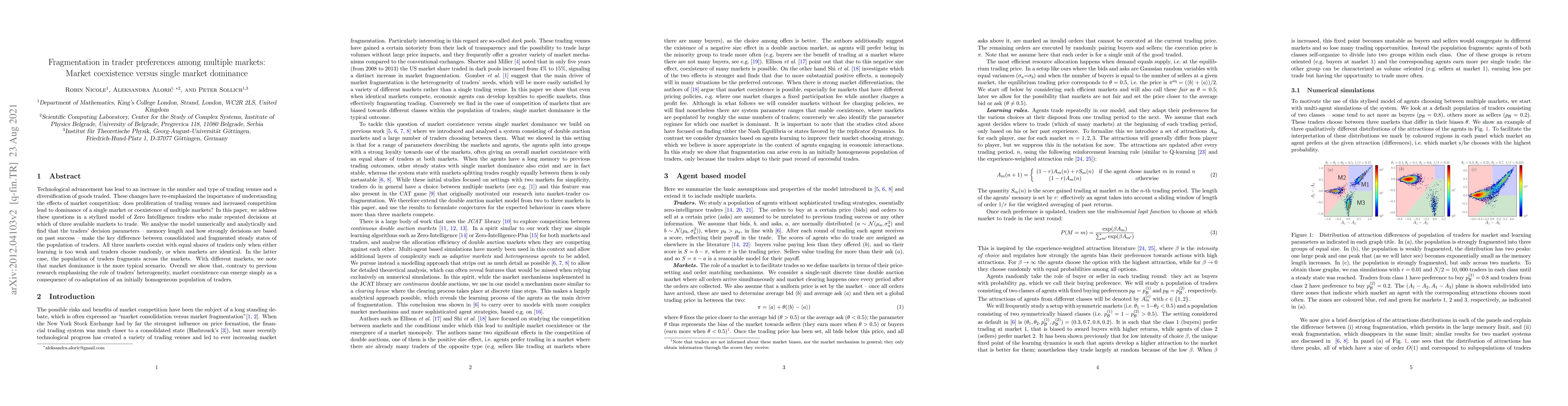 Technological advancement has lead to an increase in number and type of trading venues and diversification of goods traded. These changes have re-emphasized the importance of understanding the effects of market competition: does proliferation of trading venues and increased competition lead to dominance of a single market or coexistence of multiple markets? In this paper, we address these questions in a stylized model of Zero Intelligence traders who make repeated decisions at which of three available markets to trade. We analyse the model numerically and analytically and find that parameters that govern traders' decisions -- memory length and intensity of choice, e.g. how strongly decisions are based on past success -- make the key distinctions between consolidated and fragmented steady states of the population of traders. All three markets coexist with equal shares of traders only when either learning is too weak and traders choose randomly, or when markets are identical. In the latter case, the population of traders is fragmented across the markets. For the more general case of markets with different biases, we note that market dominance is the more typical scenario. These results are interesting because previously either strong differentiation of markets or heterogeneity in the needs of traders was found to be a necessary condition for market coexistence. We show that, in contrast, these states can emerge simply as a consequence of co-adaptation of an initially homogeneous population of traders.