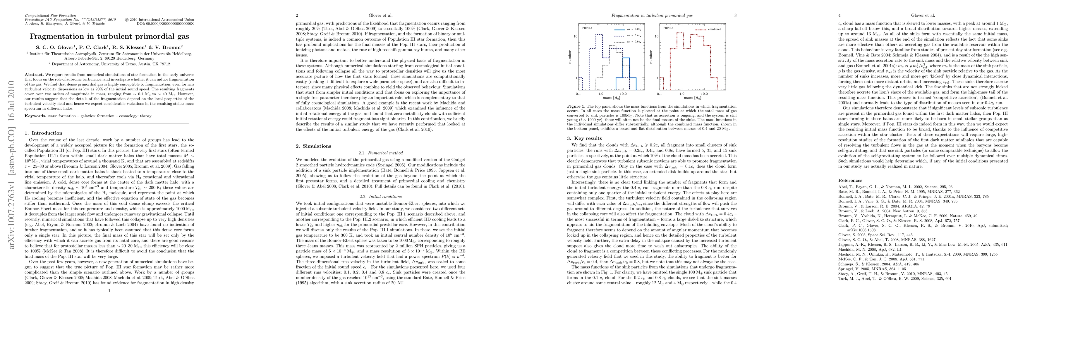 This study uses numerical simulations to explore star formation in turbulent primordial gas, finding that subsonic turbulence can induce significant fragmentation, leading to fragments spanning a wide mass range from 0.1 to 40 solar masses. The fragmentation details vary based on local turbulent velocity properties, suggesting diverse stellar mass distributions across different cosmic halos.