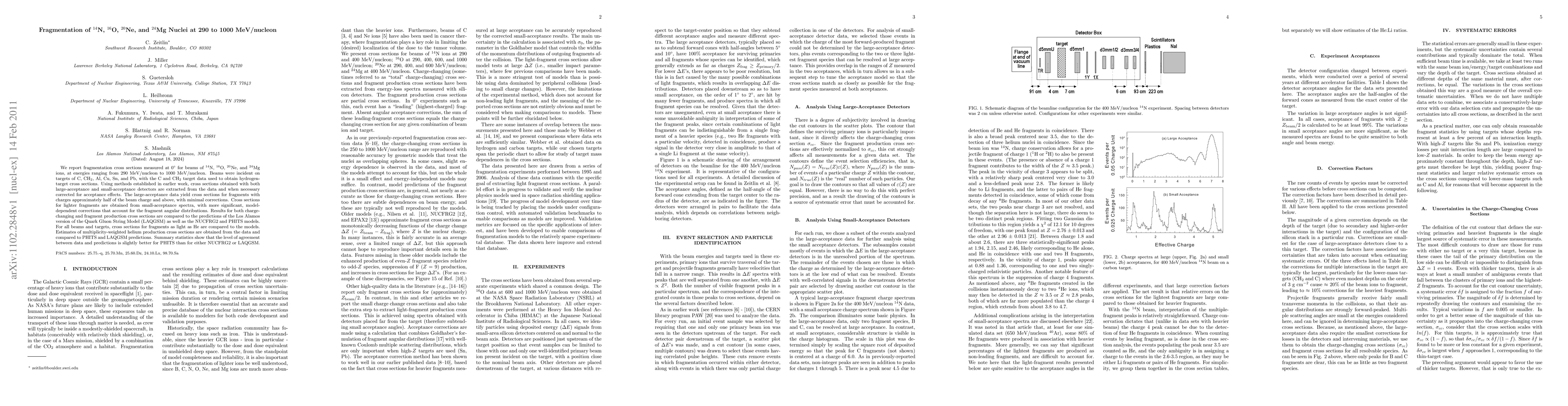 We report fragmentation cross sections measured at 0 deg for beams of 14-N, 16-O, 20-Ne, and 24-Mg ions, at energies ranging from 290 MeV/nucleon to 1000 MeV/nucleon. Beams were incident on targets of C, CH2, Al, Cu, Sn, and Pb, with the C and CH2 target data used to obtain hydrogen-target cross sections. Using methods established in earlier work, cross sections obtained with both large-acceptance and small-acceptance detectors are extracted from the data and when necessary corrected for acceptance effects. The large-acceptance data yield cross sections for fragments with charges approximately half of the beam charge and above, with minimal corrections. Cross sections for lighter fragments are obtained from small-acceptance spectra, with more significant, model-dependent corrections that account for the fragment angular distributions. Results for both charge-changing and fragment production cross sections are compared to the predictions of the Los Alamos version of the Quark Gluon String Model (LAQGSM) as well as the NUCFRG2 and PHITS models. For all beams and targets, cross sections for fragments as light as He are compared to the models. Estimates of multiplicity-weighted helium production cross sections are obtained from the data and compared to PHITS and LAQGSM predictions. Summary statistics show that the level of agreement between data and predictions is slightly better for PHITS than for either NUCFRG2 or LAQGSM.