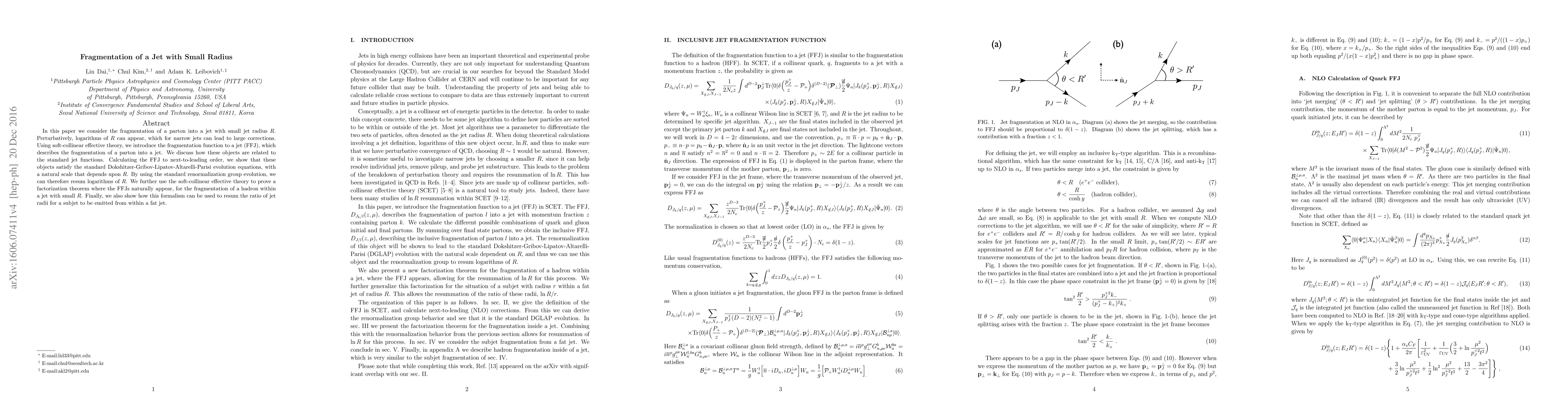This paper investigates the fragmentation of a parton into a jet with a small radius $R$, introducing the fragmentation function to a jet (FFJ) to describe this process. It calculates the FFJ to next-to-leading order and demonstrates its consistency with the Dokshitzer-Gribov-Lipatov-Altarelli-Parisi evolution equations, enabling the resummation of logarithms of $R$ and proving a factorization theorem for hadron fragmentation within small-radius jets.