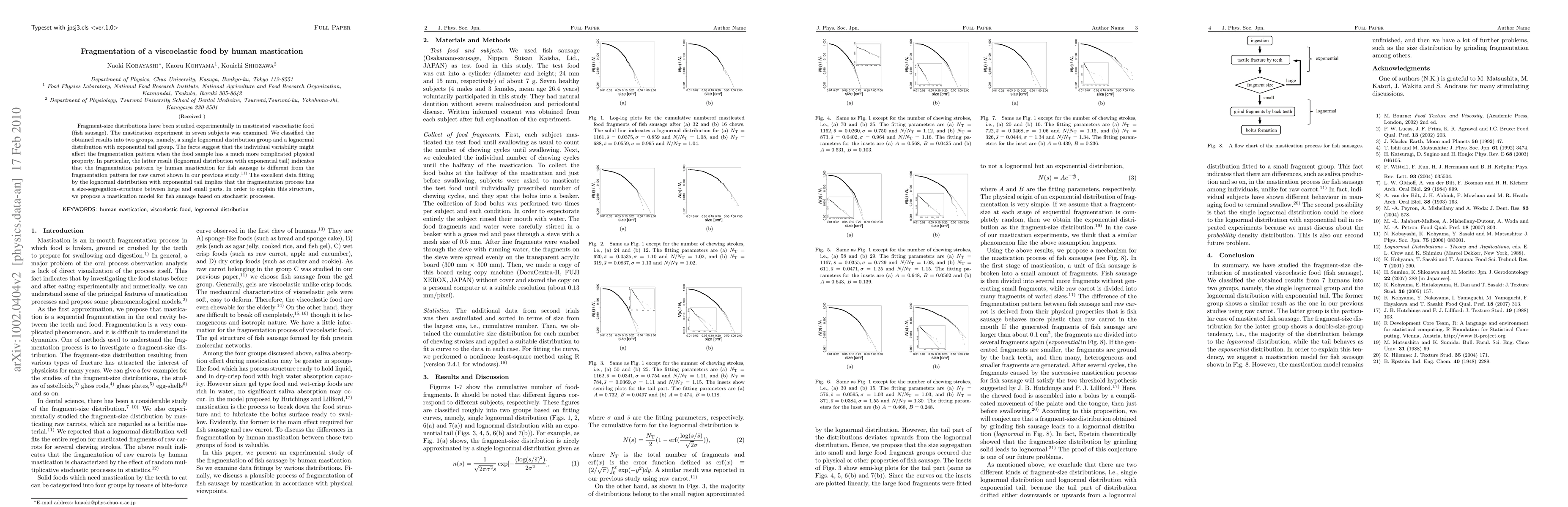 Fragment-size distributions have been studied experimentally in masticated viscoelastic food (fish sausage).The mastication experiment in seven subjects was examined. We classified the obtained results into two groups, namely, a single lognormal distribution group and a lognormal distribution with exponential tail group. The facts suggest that the individual variability might affect the fragmentation pattern when the food sample has a much more complicated physical property. In particular, the latter result (lognormal distribution with exponential tail) indicates that the fragmentation pattern by human mastication for fish sausage is different from the fragmentation pattern for raw carrot shown in our previous study. The excellent data fitting by the lognormal distribution with exponential tail implies that the fragmentation process has a size-segregation-structure between large and small parts.In order to explain this structure, we propose a mastication model for fish sausage based on stochastic processes.