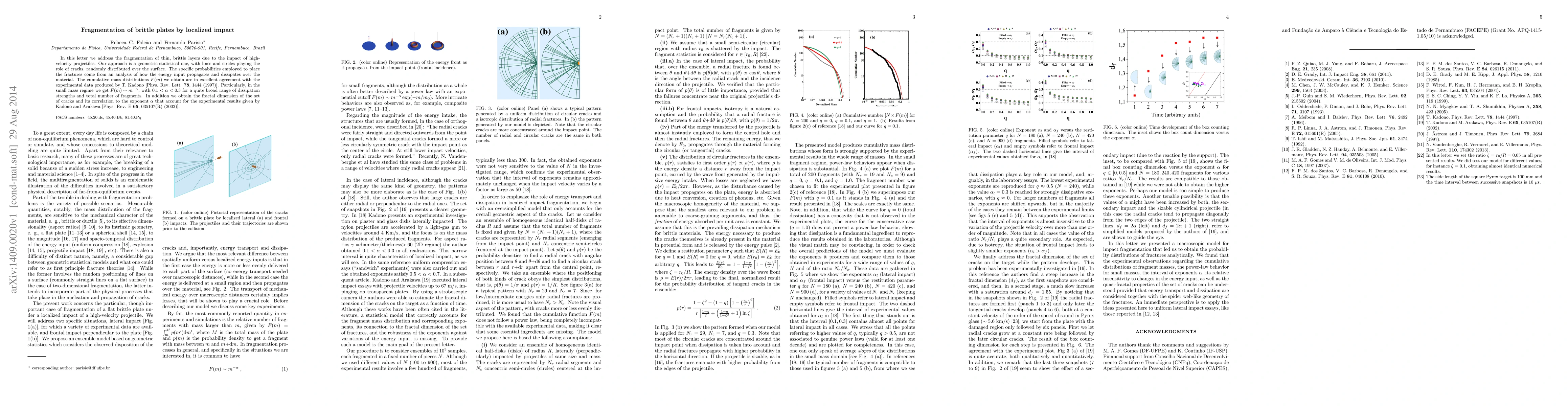 In this letter we address the fragmentation of thin, brittle layers due to the impact of high-velocity projectiles. Our approach is a geometric statistical one, with lines and circles playing the role of cracks, randomly distributed over the surface. The specific probabilities employed to place the fractures come from an analysis of how the energy input propagates and dissipates over the material. The cumulative mass distributions $F(m)$ we obtain are in excellent agreement with the experimental data produced by T. Kadono [Phys. Rev. Lett. {\bf 78}, 1444 (1997)]. Particularly, in the small mass regime we get $F(m)\sim m^{-\alpha}$, with $0.1<\alpha<0.3$ for a quite broad range of dissipation strengths and total number of fragments. In addition we obtain the fractal dimension of the set of cracks and its correlation to the exponent $\alpha$ that account for the experimental results given by Kadono and Arakawa [Phys. Rev. E {\bf 65}, 035107(R) (2002)].