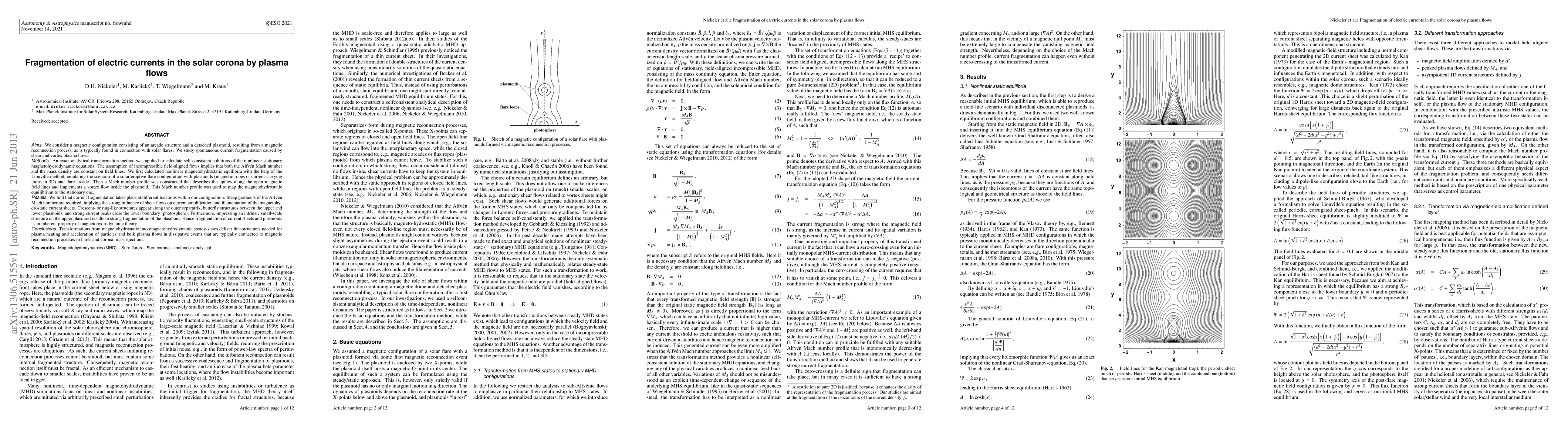 This research uses analytical methods to study how electric currents in the solar corona fragment due to plasma flows. It finds that shear and vortex flows cause current fragmentation in magnetic configurations similar to solar flares, leading to crescent, butterfly, and peak structures. The study suggests that current and plasmoid fragmentation are fundamental properties of MHD theory, crucial for plasma heating and particle acceleration in solar events like flares and coronal mass ejections.