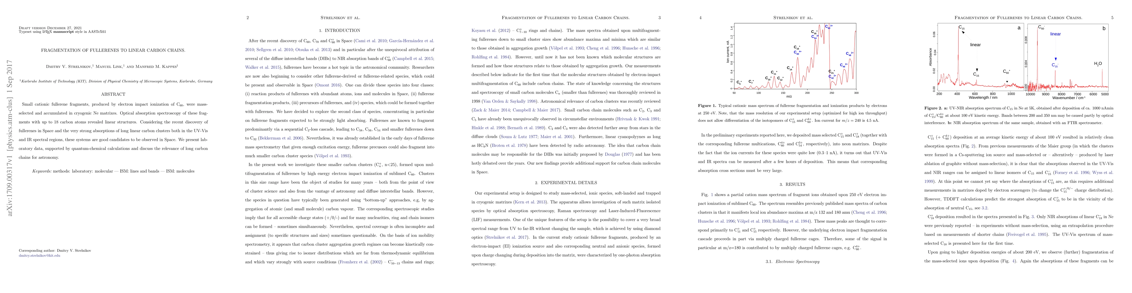 The research investigates the fragmentation of cationic fullerene fragments into linear carbon chains using optical absorption spectroscopy in cryogenic Ne matrixes. These linear carbon chains, potentially observable in space, were identified via laboratory data and quantum-chemical calculations, highlighting their relevance in astronomical contexts.