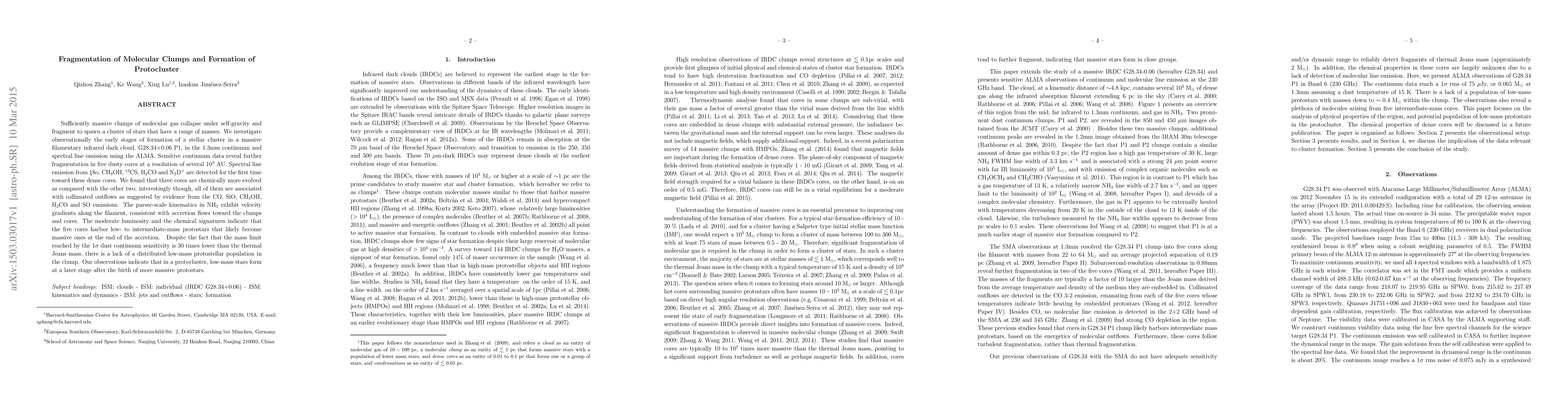 Sufficiently massive clumps of molecular gas collapse under self-gravity and fragment to spawn a cluster of stars that have a range of masses. We investigate observationally the early stages of formation of a stellar cluster in a massive filamentary infrared dark cloud, G28.34+0.06 P1, in the 1.3mm continuum and spectral line emission using the ALMA. Sensitive continuum data reveal further fragmentation in five dusty cores at a resolution of several 10^3 AU. Spectral line emission from C18O, CH3OH, 13CS, H2CO and N2D+ are detected for the first time toward these dense cores. We found that three cores are chemically more evolved as compared with the other two; interestingly though, all of them are associated with collimated outflows as suggested by evidence from the CO, SiO, CH3OH, H2CO and SO emissions. The parsec-scale kinematics in NH3 exhibit velocity gradients along the filament, consistent with accretion flows toward the clumps and cores. The moderate luminosity and the chemical signatures indicate that the five cores harbor low- to intermediate-mass protostars that likely become massive ones at the end of the accretion. Despite the fact that the mass limit reached by the 1\sigma dust continuum sensitivity is 30 times lower than the thermal Jeans mass, there is a lack of a distributed low-mass protostellar population in the clump. Our observations indicate that in a protocluster, low-mass stars form at a later stage after the birth of more massive protostars.