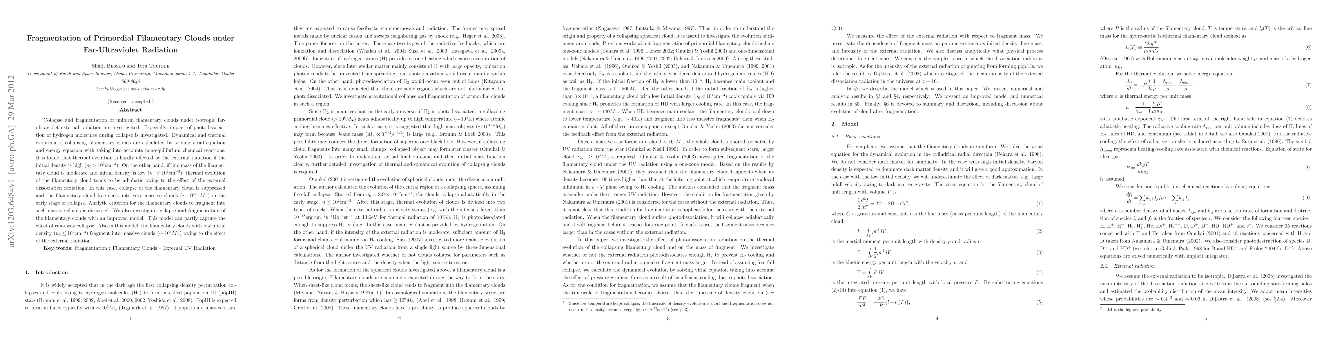 This paper investigates the collapse and fragmentation of filamentary clouds under far-ultraviolet radiation, finding that high initial densities suppress thermal evolution. Low initial densities lead to adiabatic collapse and fragmentation into massive clouds ($\sim 10^{4-5} M_\odot$), with an improved model capturing the effect of run-away collapse.