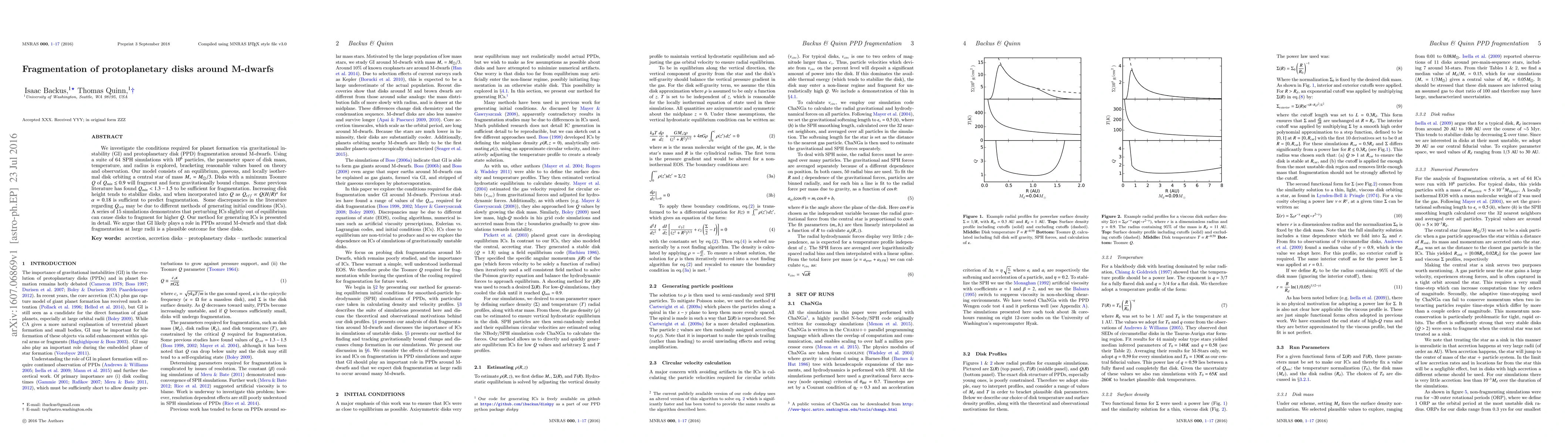 This study explores the conditions for gravitational instability and fragmentation in protoplanetary disks around M-dwarfs using SPH simulations. Disks with a minimum Toomre $Q$ of $Q_{min} \lesssim 0.9$ fragment, suggesting that $Q_{eff}$ incorporating disk height can predict fragmentation, with GI likely contributing to planet formation in these disks.