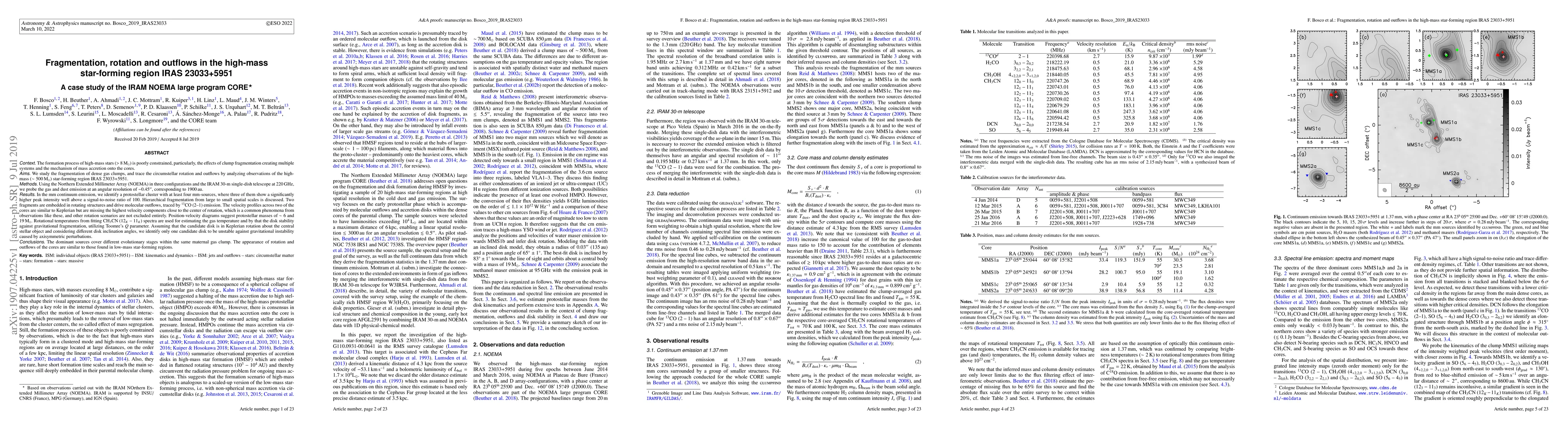 This paper investigates the fragmentation and rotation in the high-mass star-forming region IRAS 23033+5951, identifying a protostellar cluster with at least four mm-sources. It finds evidence of hierarchical fragmentation and rotating structures driving molecular outflows, with only one candidate disk potentially unstable against gravitational fragmentation.