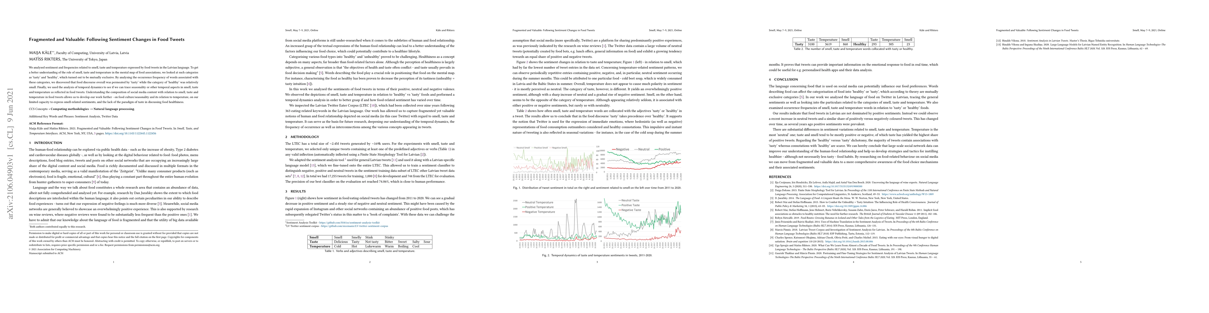 We analysed sentiment and frequencies related to smell, taste and temperature expressed by food tweets in the Latvian language. To get a better understanding of the role of smell, taste and temperature in the mental map of food associations, we looked at such categories as 'tasty' and 'healthy', which turned out to be mutually exclusive. By analysing the occurrence frequency of words associated with these categories, we discovered that food discourse overall was permeated by `tasty' while the category of 'healthy' was relatively small. Finally, we used the analysis of temporal dynamics to see if we can trace seasonality or other temporal aspects in smell, taste and temperature as reflected in food tweets. Understanding the composition of social media content with relation to smell, taste and temperature in food tweets allows us to develop our work further - on food culture/seasonality and its relation to temperature, on our limited capacity to express smell-related sentiments, and the lack of the paradigm of taste in discussing food healthiness.