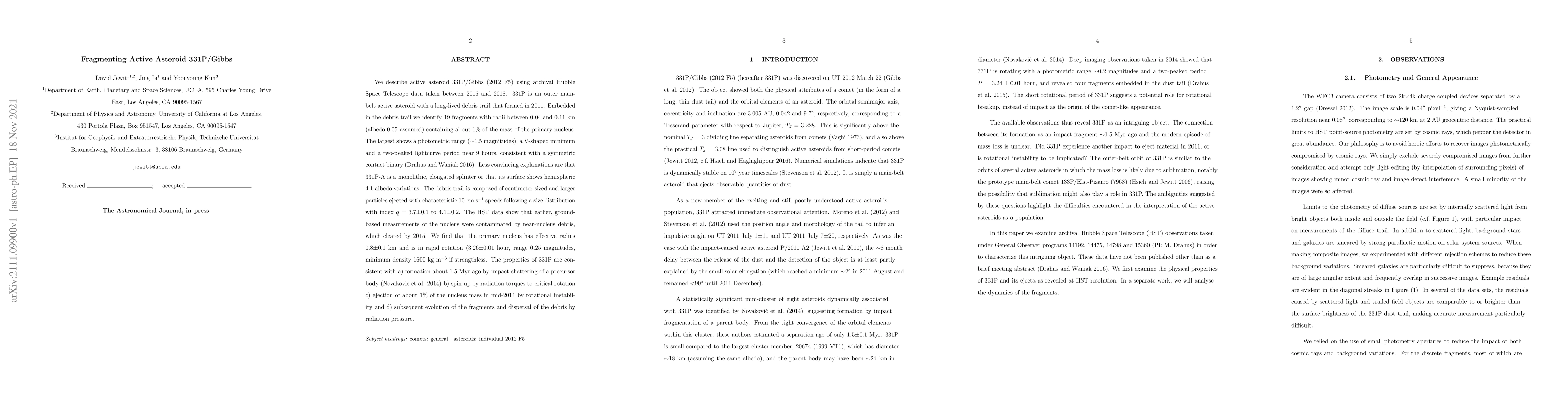 We describe active asteroid 331P/Gibbs (2012 F5) using archival Hubble Space Telescope data taken between 2015 and 2018. 331P is an outer main-belt active asteroid with a long-lived debris trail that formed in 2011. Embedded in the debris trail we identify 19 fragments with radii between 0.04 and 0.11 km (albedo 0.05 assumed) containing about 1 percent of the mass of the primary nucleus. The largest shows a photometric range (1.5 magnitudes), a V-shaped minimum and a two-peaked lightcurve period near 9 hours, consistent with a symmetric contact binary (Drahus and Waniak 2016). Less convincing explanations are that 331P-A is a monolithic, elongated splinter or that its surface shows hemispheric 4:1 albedo variations. The debris trail is composed of centimeter sized and larger particles ejected with characteristic 10 cm s$^{-1}$ speeds following a size distribution with index q = 3.7+/-0.1 to 4.1+/-0.2. The HST data show that earlier, ground-based measurements of the nucleus were contaminated by near-nucleus debris, which cleared by 2015. We find that the primary nucleus has effective radius 0.8+/-0.1 km and is in rapid rotation (3.26+/-0.01 hour, range 0.25 magnitudes, minimum density 1600 kg/m3 if strengthless. The properties of 331P are consistent with a) formation about 1.5 Myr ago by impact shattering of a precursor body (Novakovic et al. 2014) b) spin-up by radiation torques to critical rotation c) ejection of about 1 percent of the nucleus mass in mid-2011 by rotational instability and d) subsequent evolution of the fragments and dispersal of the debris by radiation pressure.