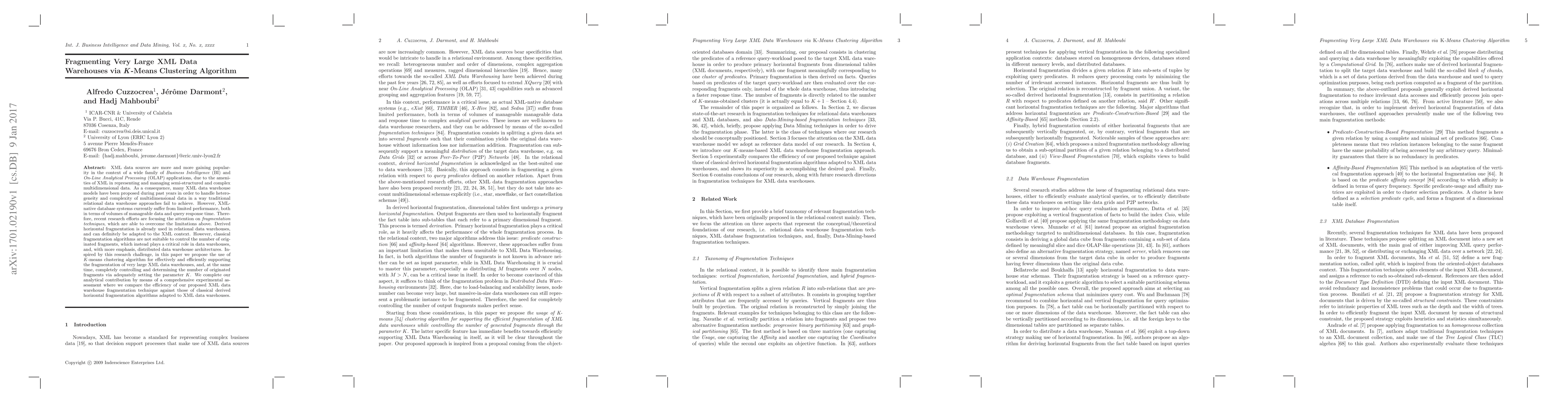 This paper proposes using the K-means clustering algorithm to fragment very large XML data warehouses efficiently while controlling the number of fragments by adjusting the parameter K. Experimental results show that this approach outperforms traditional derived horizontal fragmentation methods in terms of performance and fragment management.