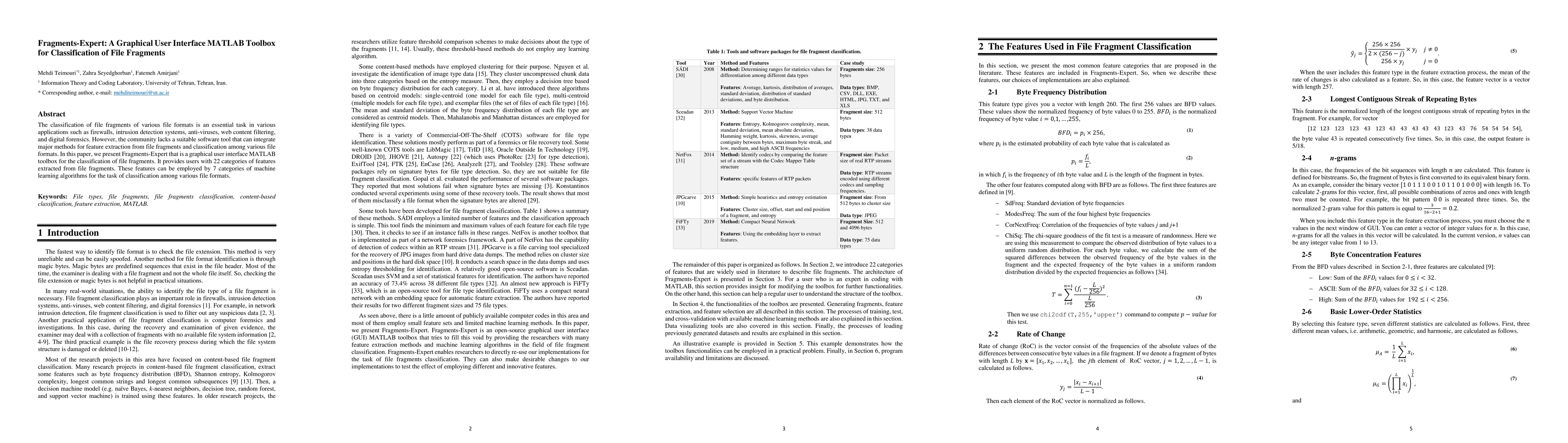 Fragments-Expert is a MATLAB toolbox with a GUI designed for classifying file fragments across various formats. It offers 22 feature categories for extraction and supports 7 machine learning algorithms for classification, addressing the lack of integrated tools in the field.