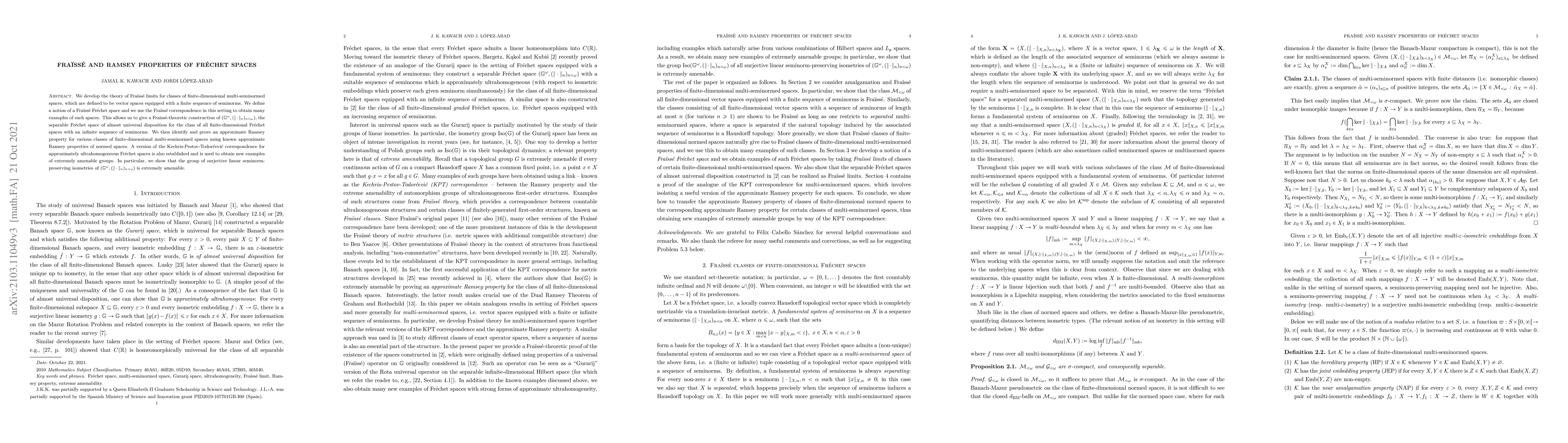We develop the theory of Fra\"iss\'e limits for classes of finite-dimensional multi-seminormed spaces, which are defined to be vector spaces equipped with a finite sequence of seminorms. We define a notion of a Fra\"iss\'e Fr\'echet space and we use the Fra\"iss\'e correspondence in this setting to obtain many examples of such spaces. This allows us to give a Fra\"iss\'e-theoretic construction of $(\mathbb{G}^\omega, (\|\cdot\|_n)_{n<\omega})$, the separable Fr\'echet space of almost universal disposition for the class of all finite-dimensional Fr\'echet spaces with an infinite sequence of seminorms. We then identify and prove an approximate Ramsey property for various classes of finite-dimensional multi-seminormed spaces using known approximate Ramsey properties of normed spaces. A version of the Kechris-Pestov-Todor\v{c}evi\'c correspondence for approximately ultrahomogeneous Fr\'echet spaces is also established and is used to obtain new examples of extremely amenable groups. In particular, we show that the group of surjective linear seminorm-preserving isometries of $(\mathbb{G}^\omega, (\|\cdot\|_n)_{n<\omega})$ is extremely amenable.