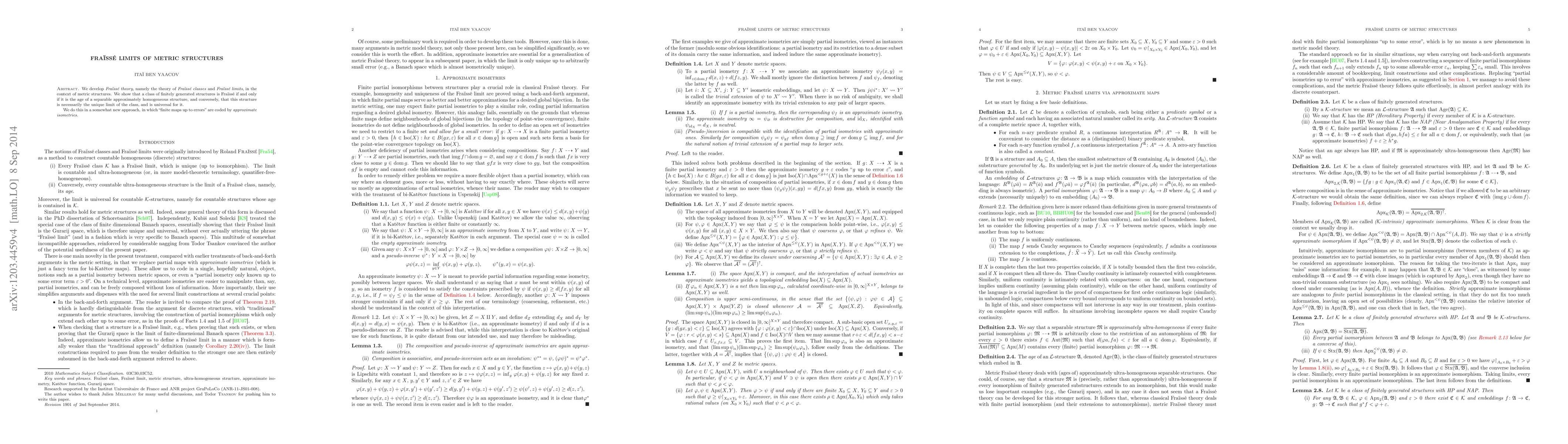 This paper develops Fraissé theory for metric structures, demonstrating that a class of finitely generated structures is Fraissé if and only if it is the age of a separable approximately homogeneous structure, which uniquely limits and universally represents the class. The approach utilizes approximate isometries to encode "finite maps up to errors."