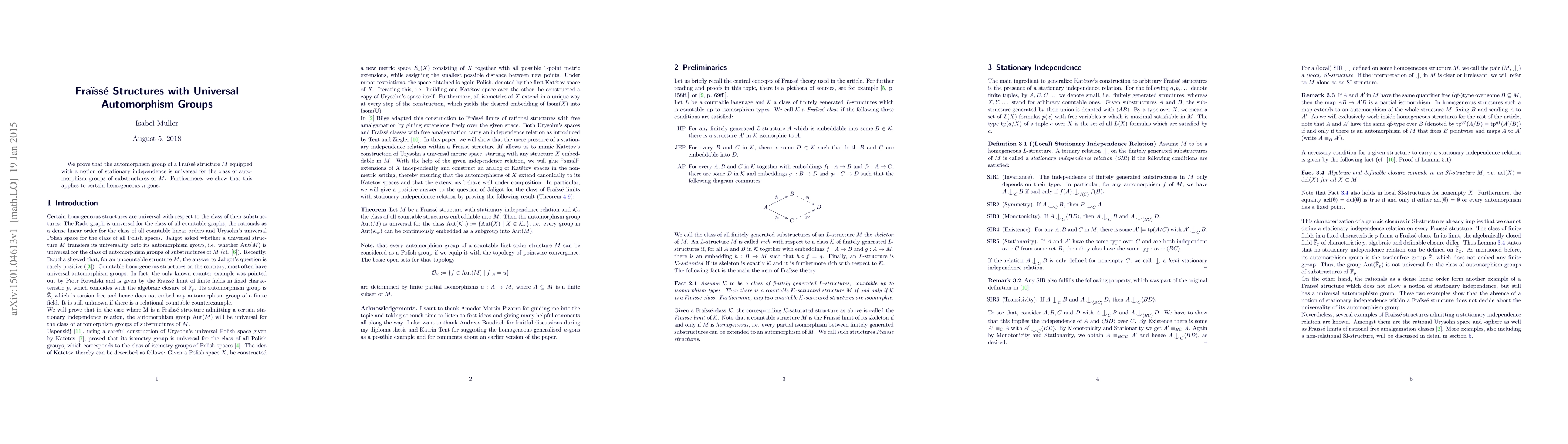 This paper demonstrates that the automorphism group of a Fraissé structure M with stationary independence is universally applicable to the automorphism groups of its substructures. It also extends this result to specific homogeneous n-gons.