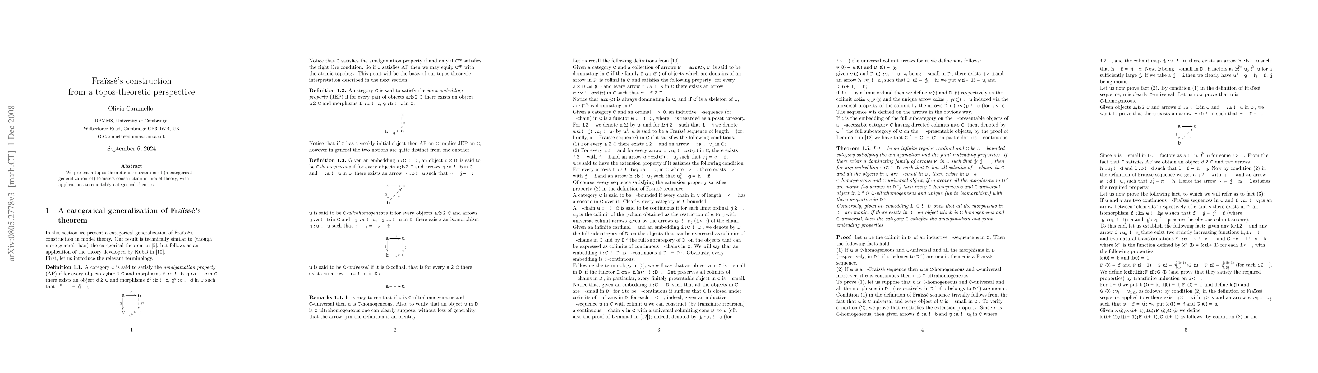 This paper offers a topos-theoretic perspective on a categorical generalization of Fraisse's construction, providing new insights into countably categorical theories through the lens of topos theory. The approach highlights connections between model theory and topos theory, enhancing our understanding of these theories.