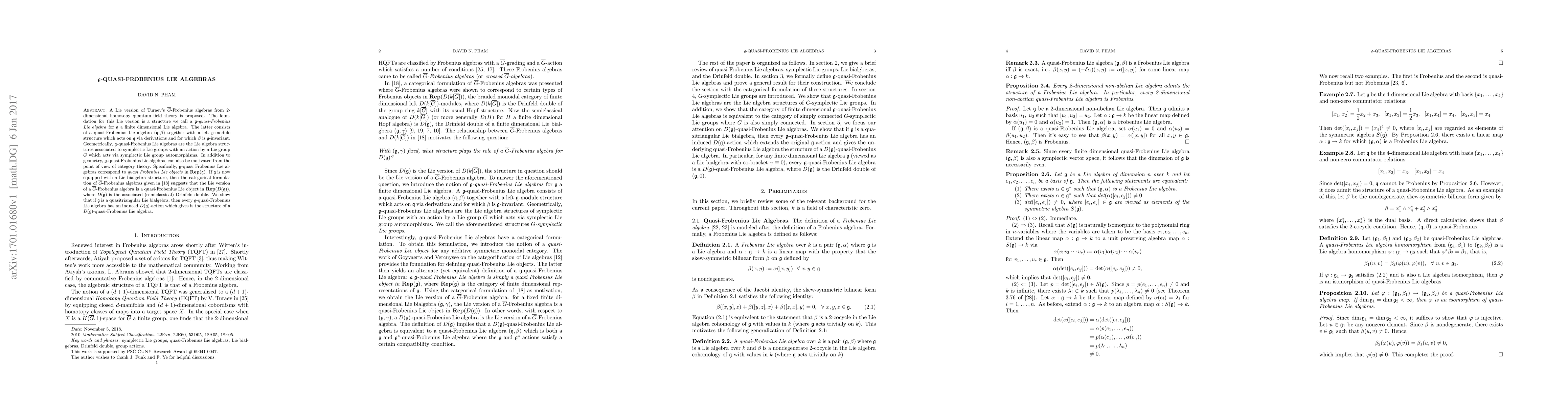 A Lie version of Turaev's $\overline{G}$-Frobenius algebras from 2-dimensional homotopy quantum field theory is proposed. The foundation for this Lie version is a structure we call a \textit{$\frak{g}$-quasi-Frobenius Lie algebra} for $\frak{g}$ a finite dimensional Lie algebra. The latter consists of a quasi-Frobenius Lie algebra $(\frak{q},\beta)$ together with a left $\frak{g}$-module structure which acts on $\frak{q}$ via derivations and for which $\beta$ is $\frak{g}$-invariant. Geometrically, $\frak{g}$-quasi-Frobenius Lie algebras are the Lie algebra structures associated to symplectic Lie groups with an action by a Lie group $G$ which acts via symplectic Lie group automorphisms. In addition to geometry, $\frak{g}$-quasi-Frobenius Lie algebras can also be motivated from the point of view of category theory. Specifically, $\frak{g}$-quasi Frobenius Lie algebras correspond to \textit{quasi Frobenius Lie objects} in $\mathbf{Rep}(\frak{g})$. If $\frak{g}$ is now equipped with a Lie bialgebra structure, then the categorical formulation of $\overline{G}$-Frobenius algebras given in \cite{KP} suggests that the Lie version of a $\overline{G}$-Frobenius algebra is a quasi-Frobenius Lie object in $\mathbf{Rep}(D(\frak{g}))$, where $D(\frak{g})$ is the associated (semiclassical) Drinfeld double. We show that if $\frak{g}$ is a quasitriangular Lie bialgebra, then every $\frak{g}$-quasi-Frobenius Lie algebra has an induced $D(\frak{g})$-action which gives it the structure of a $D(\frak{g})$-quasi-Frobenius Lie algebra.