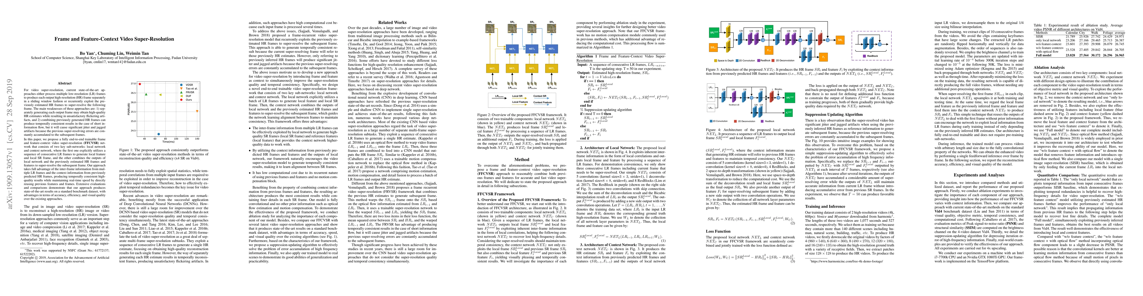 This paper proposes a novel FFCVSR network for video super-resolution that combines local frame processing with context information from previous frames to achieve high-quality and temporally consistent results, addressing the limitations of existing methods. The approach outperforms current state-of-the-art techniques in accuracy, efficiency, and visual quality.