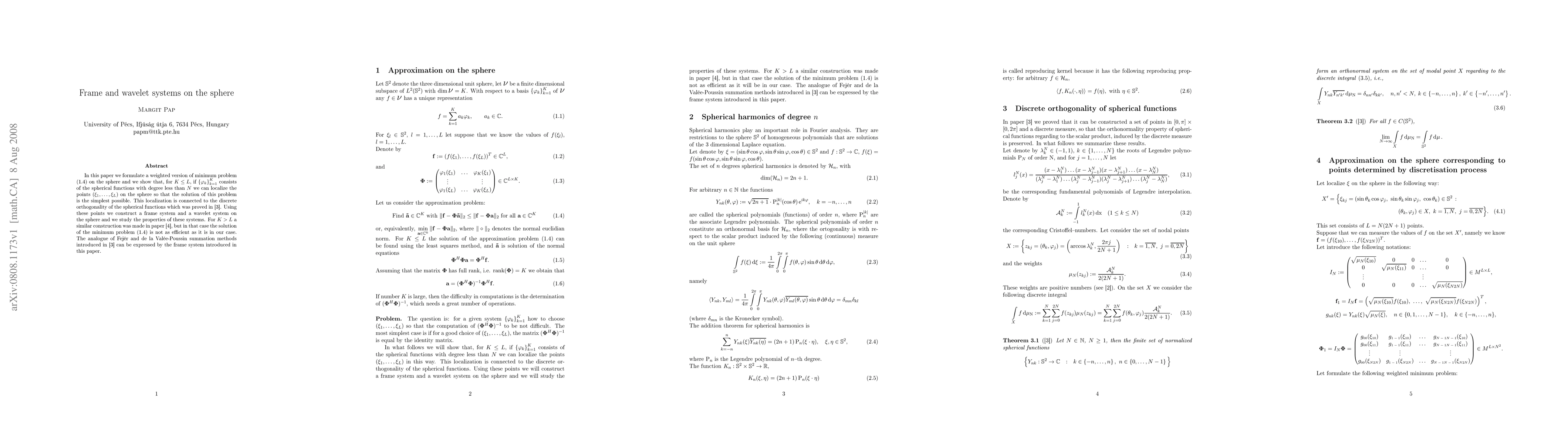 In this paper we formulate a weighted version of minimum problem (1.4) on the sphere and we show that, for $K\le L$, if $\set{\phi_k}^K_{k=1}$ consists of the spherical functions with degree less than $N$ we can localize the points $(\xi_1,...,\xi_L)$ on the sphere so that the solution of this problem is the simplest possible. This localization is connected to the discrete orthogonality of the spherical functions which was proved in [3]. Using these points we construct a frame system and a wavelet system on the sphere and we study the properties of these systems. For $K>L$ a similar construction was made in paper [4], but in that case the solution of the minimum problem (1.4) is not as efficient as it is in our case. The analogue of Fej\'er and de la Val\'ee-Poussin summation methods introduced in [3] can be expressed by the frame system introduced in this paper.