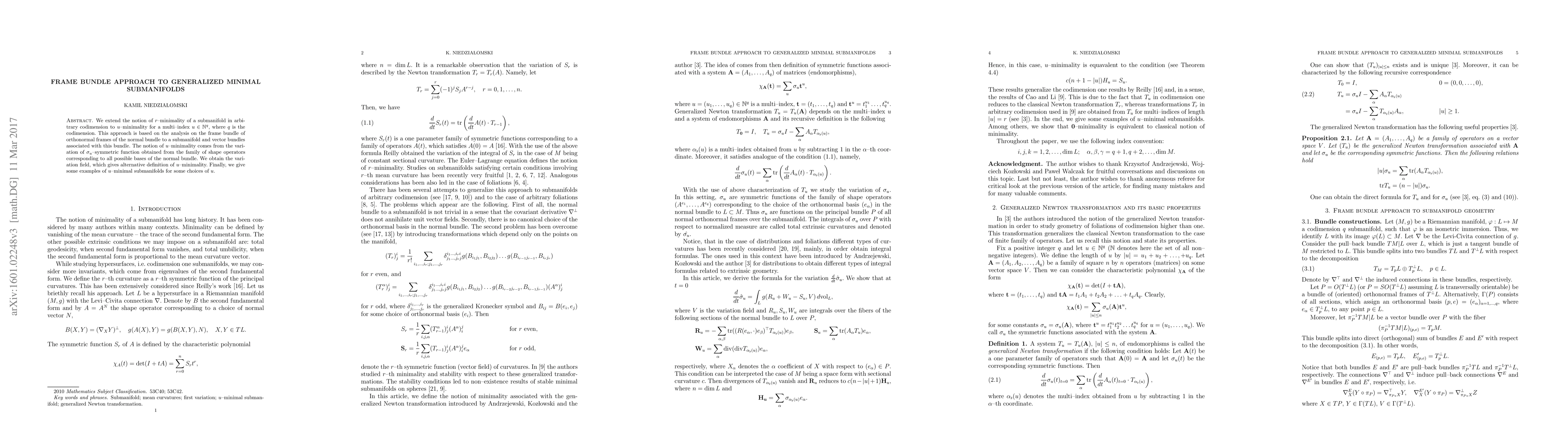 We extend the notion of $r$-minimality of a submanifold in arbitrary codimension to $u$-minimality for a multi-index $u\in\mathbb{N}^q$, where $q$ is the codimension. This approach is based on the analysis on the frame bundle of orthonormal frames of the normal bundle to a submanifold and vector bundles associated with this bundle. The notion of $u$-minimality comes from the variation of $\sigma_u$-symmetric function obtained from the family of shape operators corresponding to all possible bases of the normal bundle. We obtain the variation field, which gives alternative definition of $u$--minimality. Finally, we give some examples of $u$-minimal submanifolds for some choices of $u$.