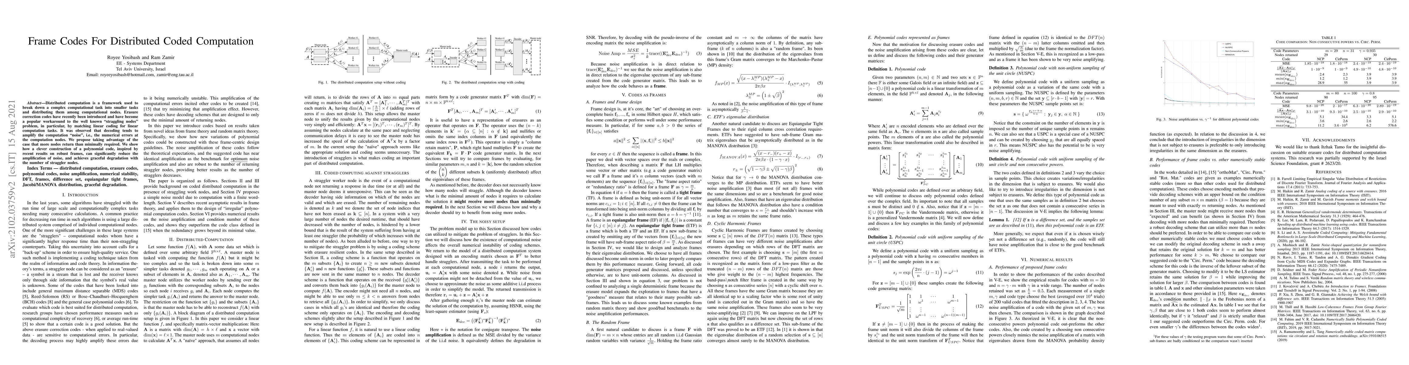 This research introduces Frame Codes for Distributed Coded Computation, addressing the straggling nodes problem in distributed tasks. By using a cleverly constructed polynomial code inspired by robust frames, it significantly reduces noise amplification caused by numerical errors at computation nodes, achieving better performance with increasing straggler nodes.