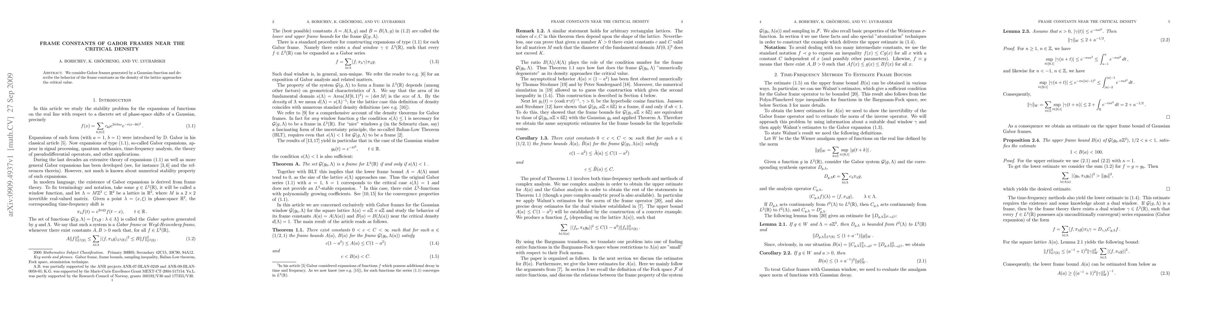 Summary: This paper investigates the behavior of Gabor frame constants generated by a Gaussian function as the lattice density nears its critical value, providing insights into the frame's stability and efficiency.