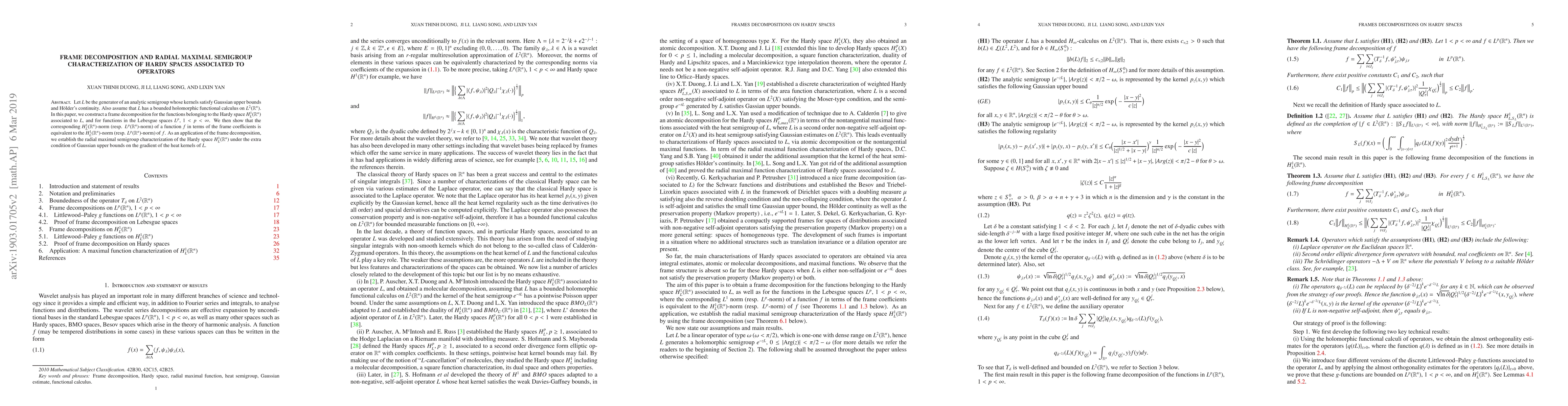 Let $L$ be the generator of an analytic semigroup whose kernels satisfy Gaussian upper bounds and H\"older's continuity. Also assume that $L$ has a bounded holomorphic functional calculus on $L^2(\mathbb{R}^n)$. In this paper, we construct a frame decomposition for the functions belonging to the Hardy space $H_{L}^{1}(\mathbb{R}^n)$ associated to $L$, and for functions in the Lebesgue spaces $L^p$, $1