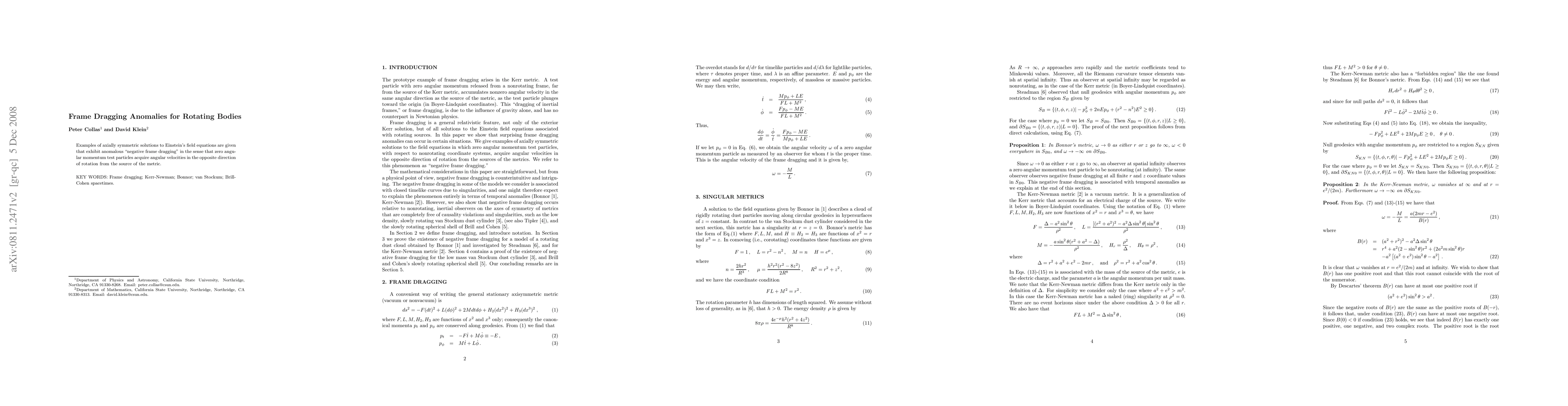 Examples of axially symmetric solutions to Einstein's field equations are given that exhibit anomalous "negative frame dragging" in the sense that zero angular momentum test particles acquire angular velocities in the opposite direction of rotation from the source of the metric.