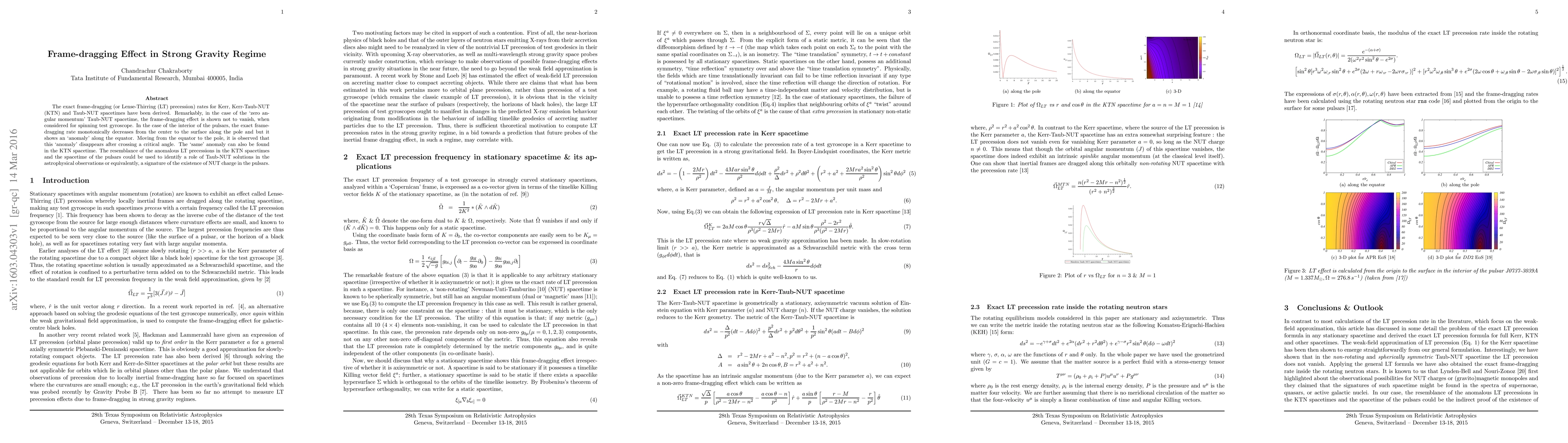 The exact frame-dragging (or Lense-Thirring (LT) precession) rates for Kerr, Kerr-Taub-NUT (KTN) and Taub-NUT spacetimes have been derived. Remarkably, in the case of the `zero angular momentum' Taub-NUT spacetime, the frame-dragging effect is shown not to vanish, when considered for spinning test gyroscope. In the case of the interior of the pulsars, the exact frame-dragging rate monotonically decreases from the center to the surface along the pole and but it shows an `anomaly' along the equator. Moving from the equator to the pole, it is observed that this `anomaly' disappears after crossing a critical angle. The `same' anomaly can also be found in the KTN spacetime. The resemblance of the anomalous LT precessions in the KTN spacetimes and the spacetime of the pulsars could be used to identify a role of Taub-NUT solutions in the astrophysical observations or equivalently, a signature of the existence of NUT charge in the pulsars.