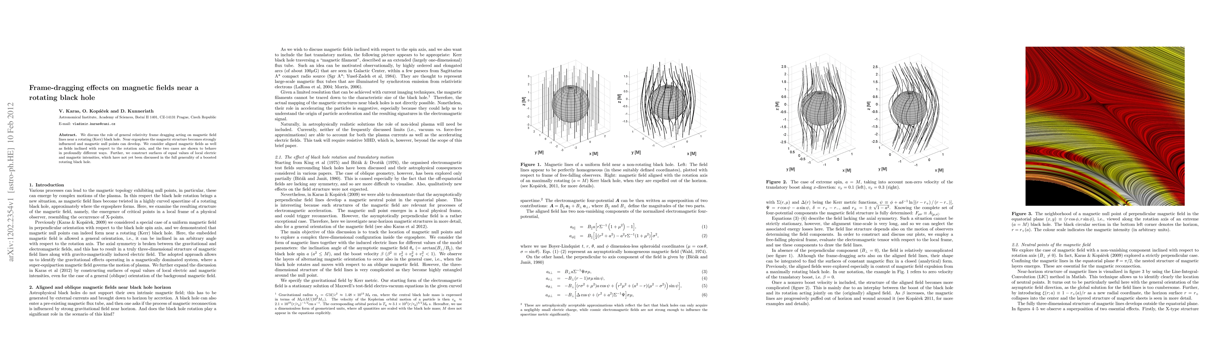 We discuss the role of general relativity frame dragging acting on magnetic field lines near a rotating (Kerr) black hole. Near ergosphere the magnetic structure becomes strongly influenced and magnetic null points can develop. We consider aligned magnetic fields as well as fields inclined with respect to the rotation axis, and the two cases are shown to behave in profoundly different ways. Further, we construct surfaces of equal values of local electric and magnetic intensities, which have not yet been discussed in the full generality of a boosted rotating black hole.