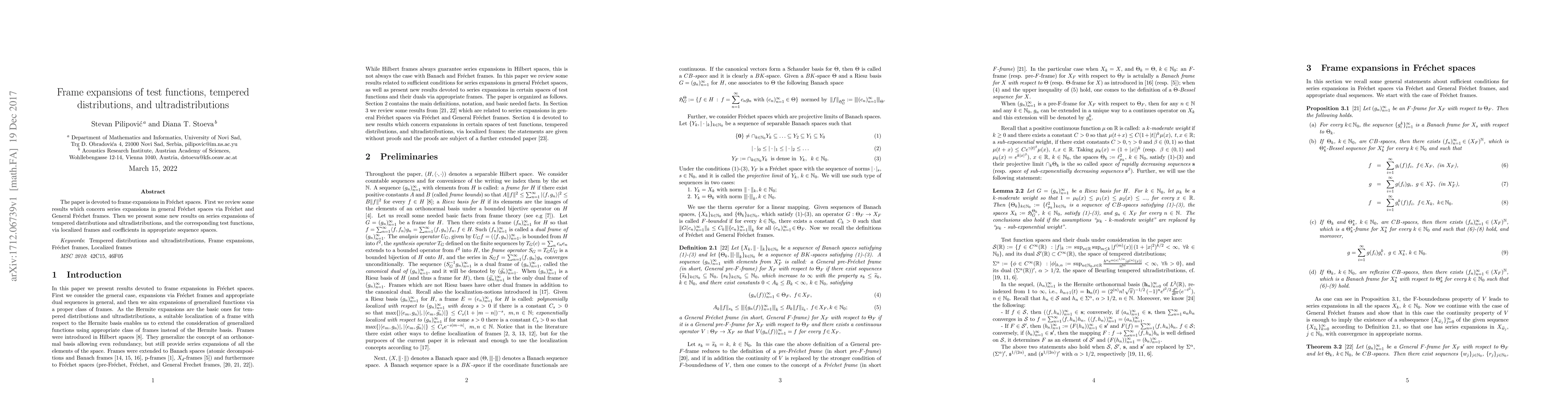 Summary: This paper discusses frame expansions in Fréchet spaces, focusing on series expansions for test functions, tempered distributions, and ultradistributions through localized frames and coefficients in sequence spaces, presenting both reviews and new findings.