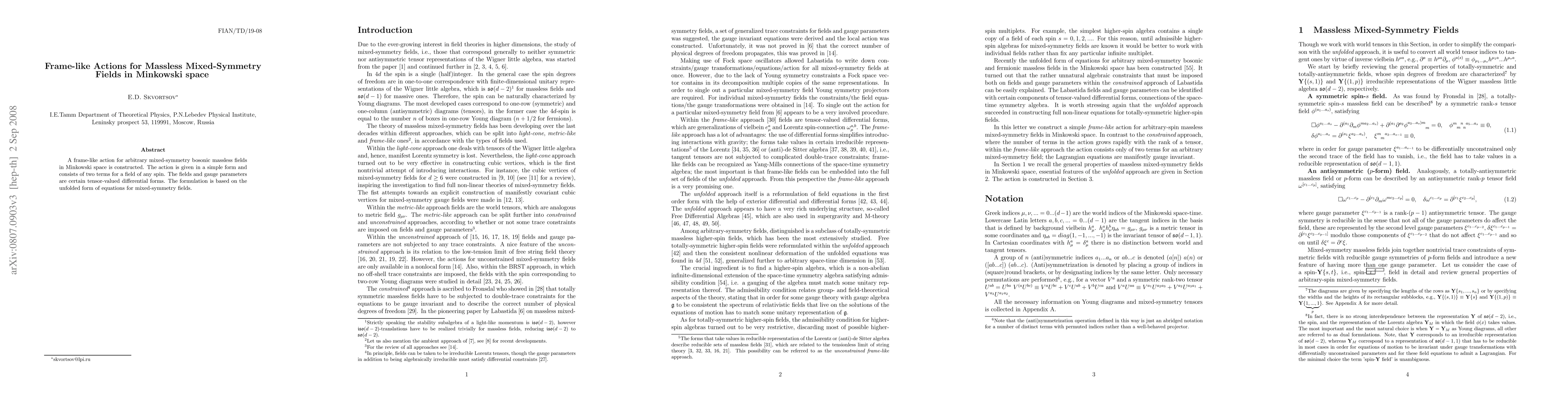 This paper constructs a frame-like action for massless mixed-symmetry bosonic fields in Minkowski space, consisting of two terms for fields of any spin. The fields and gauge parameters are represented as tensor-valued differential forms, based on the unfolded form of equations for mixed-symmetry fields.