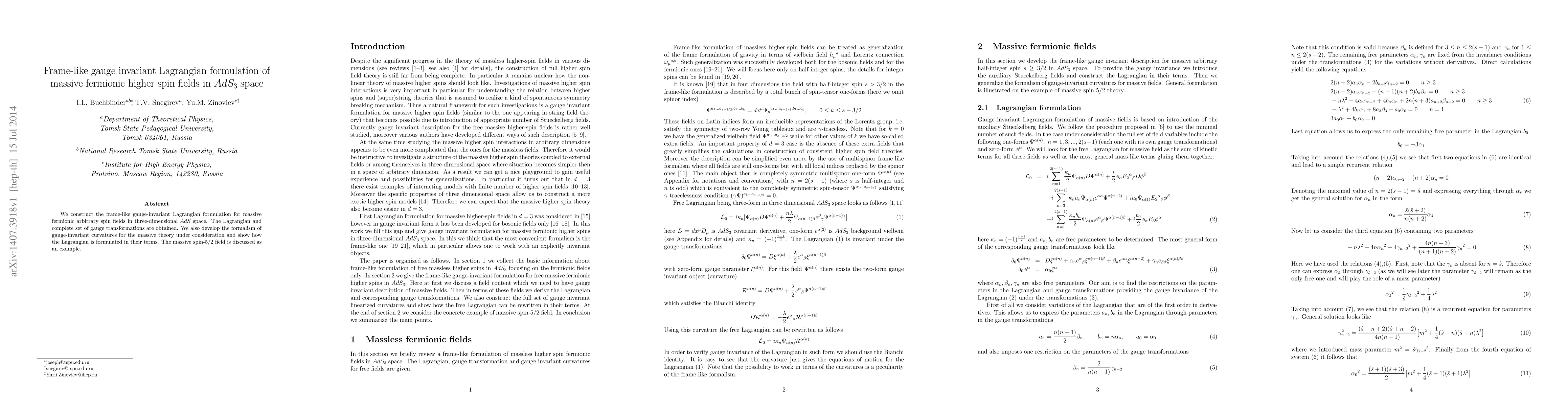 This paper constructs a frame-like gauge-invariant Lagrangian for massive fermionic fields of arbitrary spin in three-dimensional AdS space, providing a complete set of gauge transformations and introducing gauge-invariant curvatures, exemplified with a spin-5/2 field.