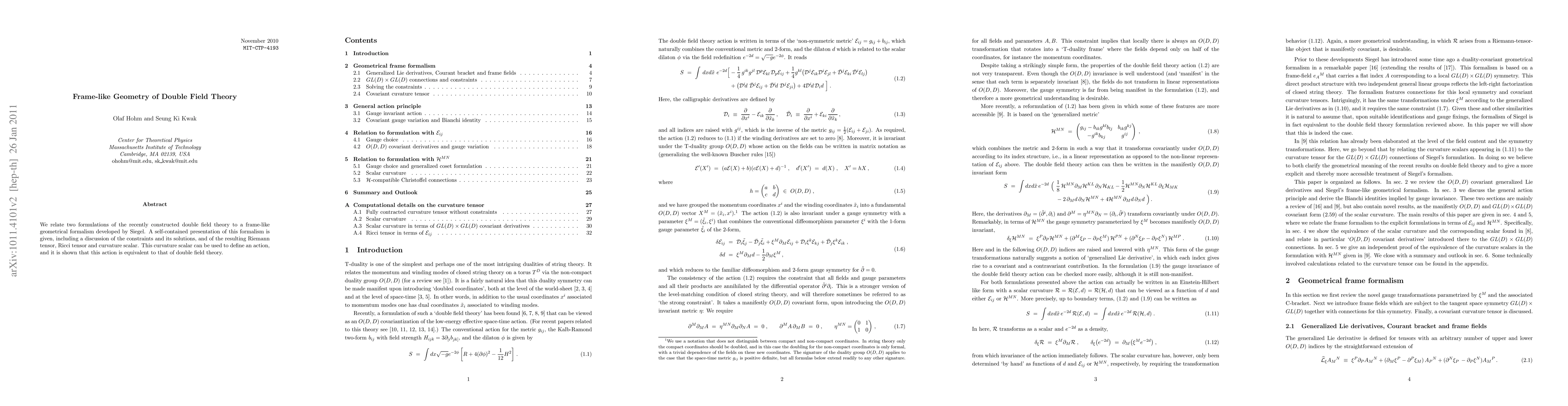 We relate two formulations of the recently constructed double field theory to a frame-like geometrical formalism developed by Siegel. A self-contained presentation of this formalism is given, including a discussion of the constraints and its solutions, and of the resulting Riemann tensor, Ricci tensor and curvature scalar. This curvature scalar can be used to define an action, and it is shown that this action is equivalent to that of double field theory.