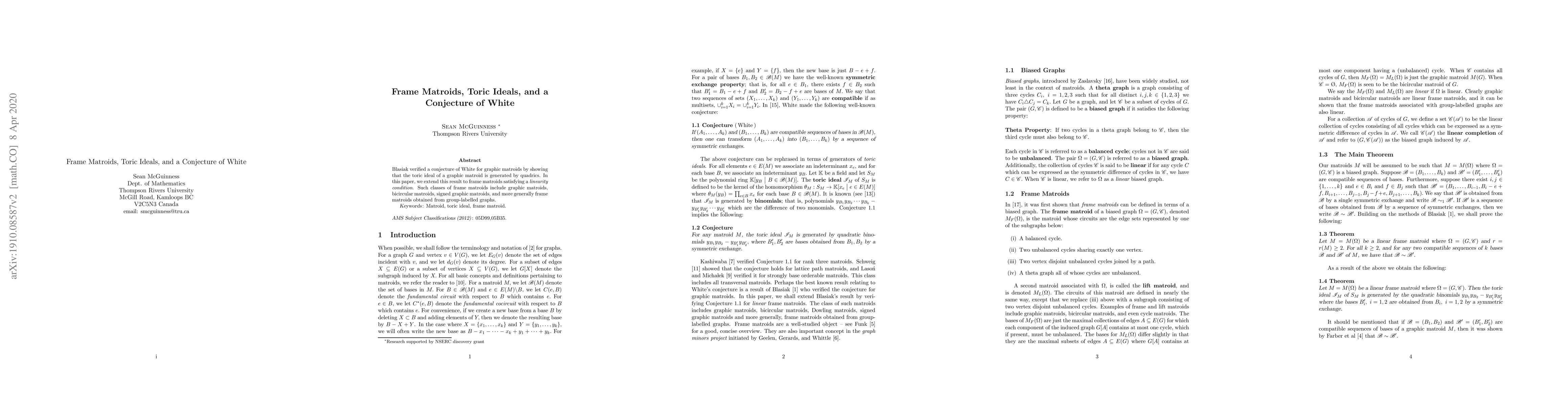 This paper extends Blasiak's verification of White's conjecture for graphic matroids to frame matroids under a linearity condition, showing that their toric ideals are generated by quadrics. This includes graphic matroids, bicircular matroids, signed graphic matroids, and frame matroids derived from group-labelled graphs.