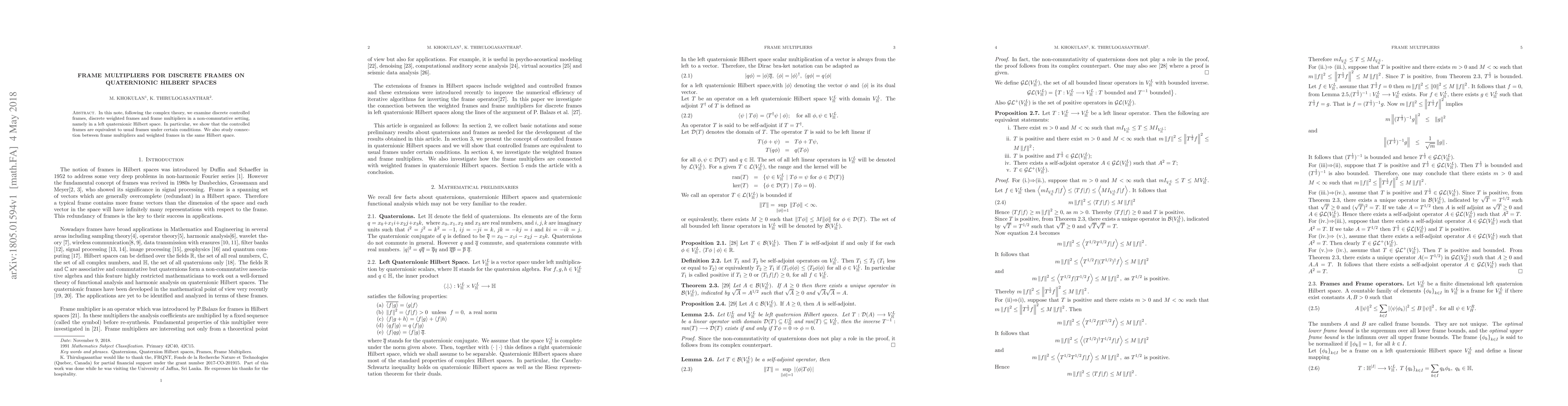 This paper explores discrete frames and frame multipliers in the non-commutative context of quaternionic Hilbert spaces, demonstrating equivalence between controlled and usual frames under specific conditions, and investigates the relationship between frame multipliers and weighted frames.