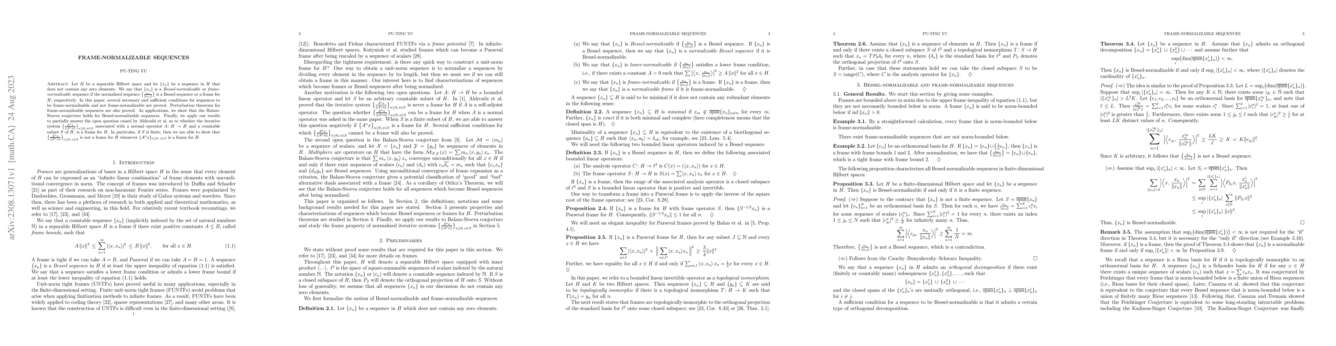 This paper explores frame-normalizable sequences in separable Hilbert spaces, proving necessary and sufficient conditions for such sequences and perturbation theorems. It also verifies the Balazs-Stoeva conjecture for Bessel-normalizable sequences and addresses the open question regarding the iterative system associated with normal operators, showing it is not a frame when the set is finite.