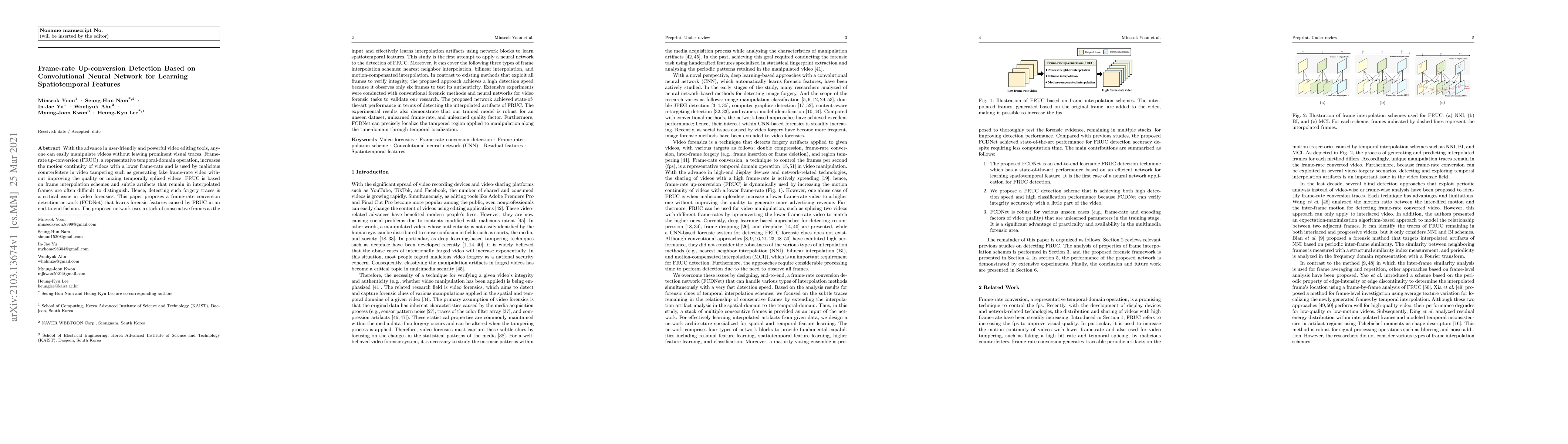 With the advance in user-friendly and powerful video editing tools, anyone can easily manipulate videos without leaving prominent visual traces. Frame-rate up-conversion (FRUC), a representative temporal-domain operation, increases the motion continuity of videos with a lower frame-rate and is used by malicious counterfeiters in video tampering such as generating fake frame-rate video without improving the quality or mixing temporally spliced videos. FRUC is based on frame interpolation schemes and subtle artifacts that remain in interpolated frames are often difficult to distinguish. Hence, detecting such forgery traces is a critical issue in video forensics. This paper proposes a frame-rate conversion detection network (FCDNet) that learns forensic features caused by FRUC in an end-to-end fashion. The proposed network uses a stack of consecutive frames as the input and effectively learns interpolation artifacts using network blocks to learn spatiotemporal features. This study is the first attempt to apply a neural network to the detection of FRUC. Moreover, it can cover the following three types of frame interpolation schemes: nearest neighbor interpolation, bilinear interpolation, and motion-compensated interpolation. In contrast to existing methods that exploit all frames to verify integrity, the proposed approach achieves a high detection speed because it observes only six frames to test its authenticity. Extensive experiments were conducted with conventional forensic methods and neural networks for video forensic tasks to validate our research. The proposed network achieved state-of-the-art performance in terms of detecting the interpolated artifacts of FRUC. The experimental results also demonstrate that our trained model is robust for an unseen dataset, unlearned frame-rate, and unlearned quality factor.