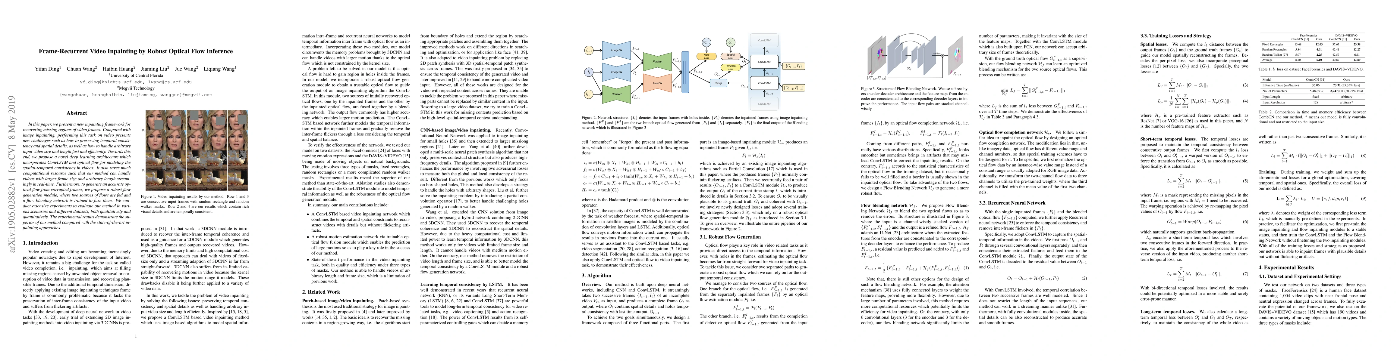 In this paper, we present a new inpainting framework for recovering missing regions of video frames. Compared with image inpainting, performing this task on video presents new challenges such as how to preserving temporal consistency and spatial details, as well as how to handle arbitrary input video size and length fast and efficiently. Towards this end, we propose a novel deep learning architecture which incorporates ConvLSTM and optical flow for modeling the spatial-temporal consistency in videos. It also saves much computational resource such that our method can handle videos with larger frame size and arbitrary length streamingly in real-time. Furthermore, to generate an accurate optical flow from corrupted frames, we propose a robust flow generation module, where two sources of flows are fed and a flow blending network is trained to fuse them. We conduct extensive experiments to evaluate our method in various scenarios and different datasets, both qualitatively and quantitatively. The experimental results demonstrate the superior of our method compared with the state-of-the-art inpainting approaches.