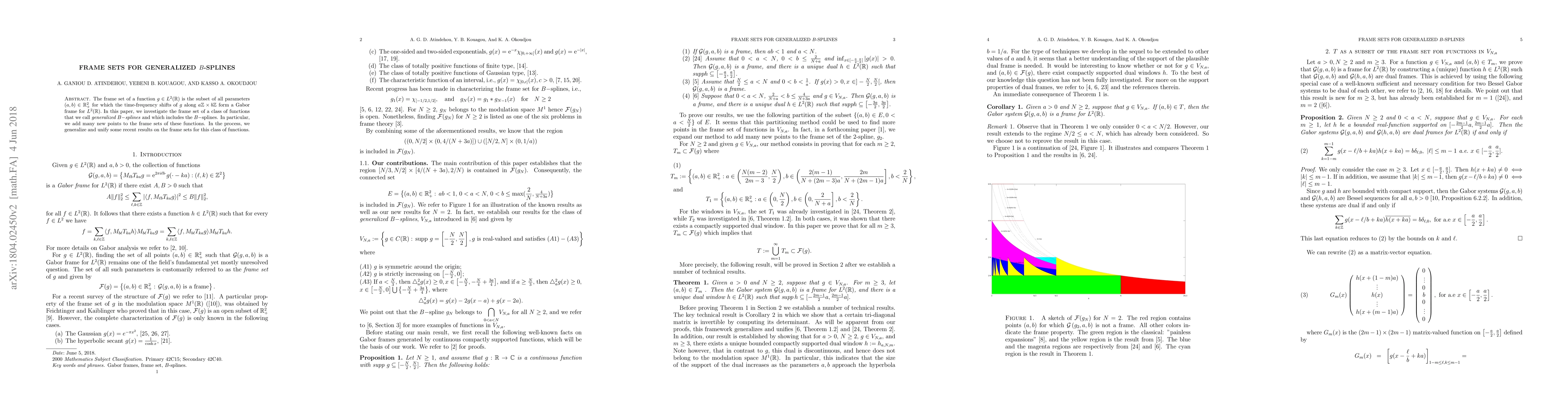 The frame set of a function $g\in L^2(\mathbb{R})$ is the subset of all parameters $(a, b)\in \mathbb{R}^2_+$ for which the time-frequency shifts of $g$ along $a\mathbb{Z}\times b\mathbb{Z}$ form a Gabor frame for $L^2(\mathbb{R}).$ In this paper, we investigate the frame set of a class of functions that we call \emph{generalized $B-$splines} and which includes the $B-$splines. In particular, we add many new points to the frame sets of these functions. In the process, we generalize and unify some recent results on the frame sets for this class of functions.