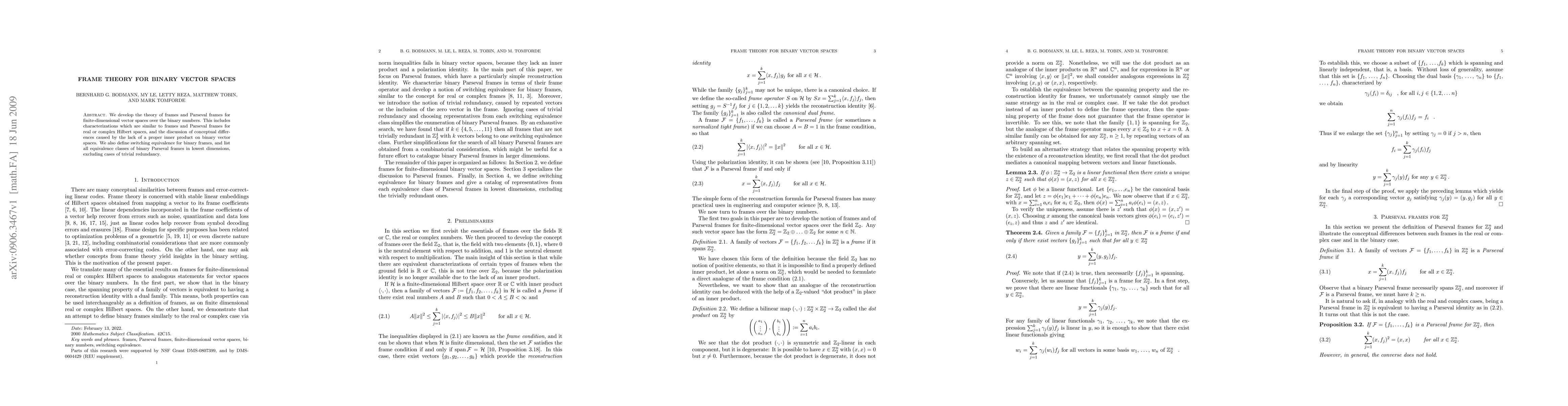 We develop the theory of frames and Parseval frames for finite-dimensional vector spaces over the binary numbers. This includes characterizations which are similar to frames and Parseval frames for real or complex Hilbert spaces, and the discussion of conceptual differences caused by the lack of a proper inner product on binary vector spaces. We also define switching equivalence for binary frames, and list all equivalence classes of binary Parseval frames in lowest dimensions, excluding cases of trivial redundancy.