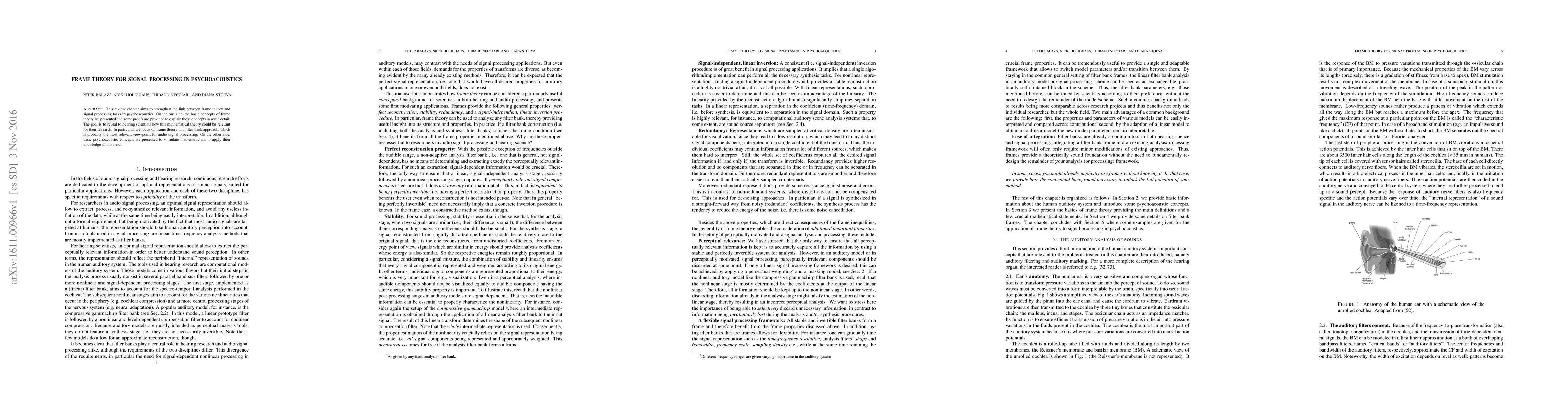 This review chapter aims to strengthen the link between frame theory and signal processing tasks in psychoacoustics. On the one side, the basic concepts of frame theory are presented and some proofs are provided to explain those concepts in some detail. The goal is to reveal to hearing scientists how this mathematical theory could be relevant for their research. In particular, we focus on frame theory in a filter bank approach, which is probably the most relevant view-point for audio signal processing. On the other side, basic psychoacoustic concepts are presented to stimulate mathematicians to apply their knowledge in this field.