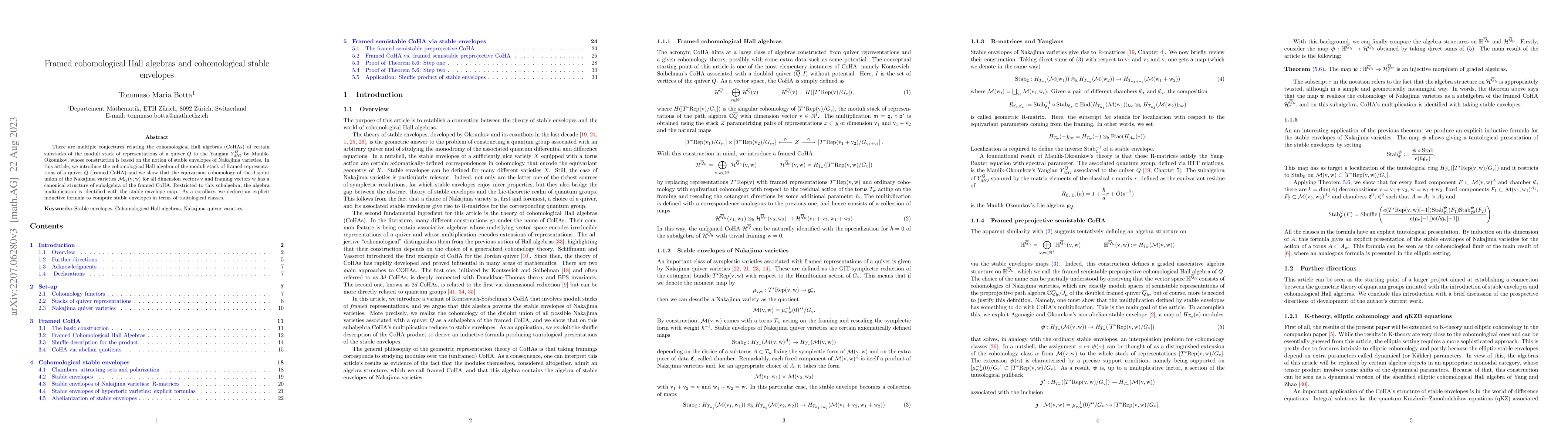 There are multiple conjectures relating the cohomological Hall algebras (CoHAs) of certain substacks of the moduli stack of representations of a quiver $Q$ to the Yangian $Y^{Q}_{MO}$ by Maulik-Okounkov, whose construction is based on the notion of stable envelopes of Nakajima varieties. In this article, we introduce the cohomological Hall algebra of the moduli stack of framed representations of a quiver $Q$ (framed CoHA) and we show that the equivariant cohomology of the disjoint union of the Nakajima varieties $\mathcal{M}_Q(\text{v},\text{w})$ for all dimension vectors $\text{v}$ and framing vectors $\text{w}$ has a canonical structure of subalgebra of the framed CoHA. Restricted to this subalgebra, the algebra multiplication is identified with the stable envelope map. As a corollary, we deduce an explicit inductive formula to compute stable envelopes in terms of tautological classes.