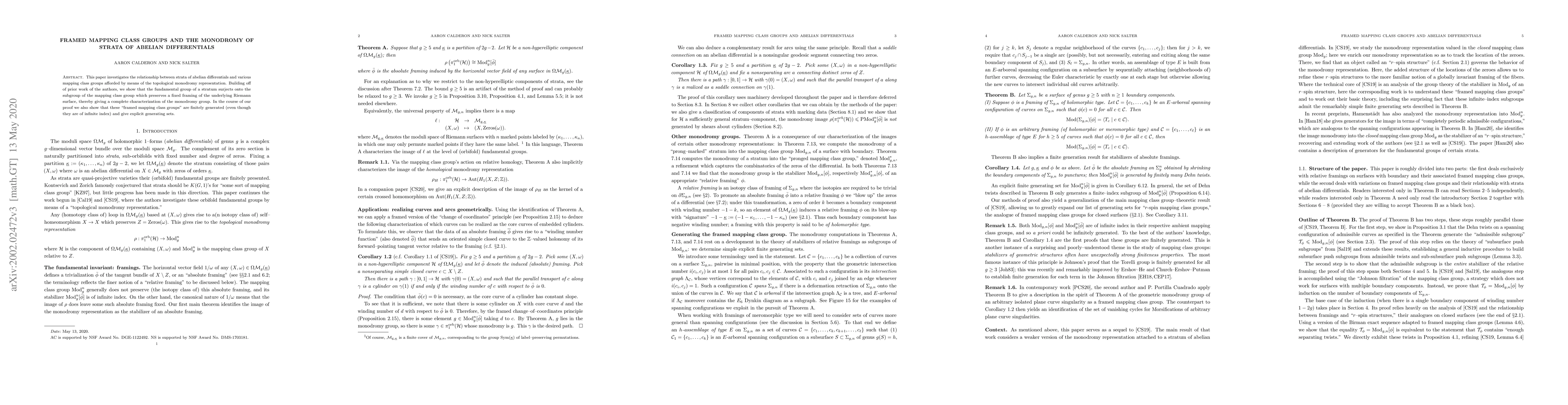 This paper shows that the monodromy group of strata of Abelian differentials can be characterized using framing-preserving mapping class groups, which are finitely generated and give new insights into the relationship between differential forms and topology.