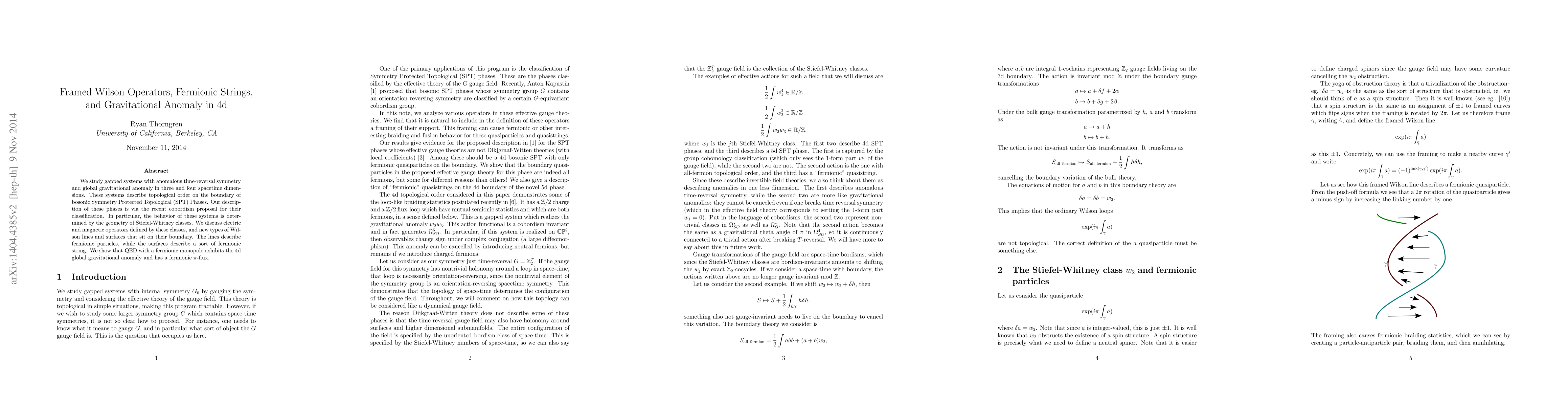 We study gapped systems with anomalous time-reversal symmetry and global gravitational anomaly in three and four spacetime dimensions. These systems describe topological order on the boundary of bosonic Symmetry Protected Topological (SPT) Phases. Our description of these phases is via the recent cobordism proposal for their classification. In particular, the behavior of these systems is determined by the geometry of Stiefel-Whitney classes. We discuss electric and magnetic operators defined by these classes, and new types of Wilson lines and surfaces that sit on their boundary. The lines describe fermionic particles, while the surfaces describe a sort of fermionic string. We show that QED with a fermionic monopole exhibits the 4d global gravitational anomaly and has a fermionic $\pi$-flux.