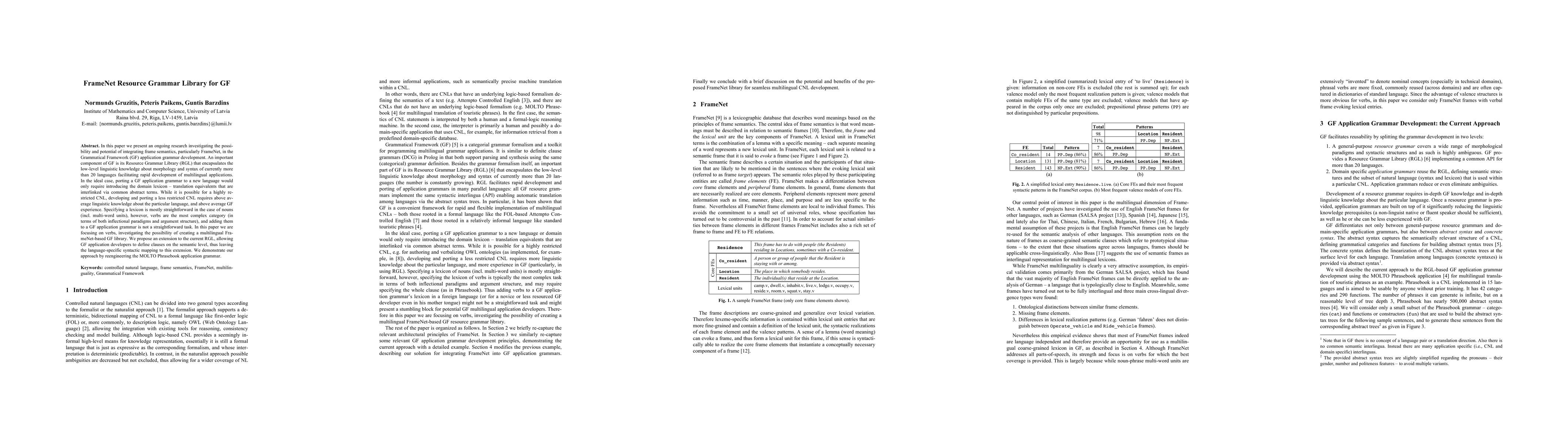 In this paper we present an ongoing research investigating the possibility and potential of integrating frame semantics, particularly FrameNet, in the Grammatical Framework (GF) application grammar development. An important component of GF is its Resource Grammar Library (RGL) that encapsulates the low-level linguistic knowledge about morphology and syntax of currently more than 20 languages facilitating rapid development of multilingual applications. In the ideal case, porting a GF application grammar to a new language would only require introducing the domain lexicon - translation equivalents that are interlinked via common abstract terms. While it is possible for a highly restricted CNL, developing and porting a less restricted CNL requires above average linguistic knowledge about the particular language, and above average GF experience. Specifying a lexicon is mostly straightforward in the case of nouns (incl. multi-word units), however, verbs are the most complex category (in terms of both inflectional paradigms and argument structure), and adding them to a GF application grammar is not a straightforward task. In this paper we are focusing on verbs, investigating the possibility of creating a multilingual FrameNet-based GF library. We propose an extension to the current RGL, allowing GF application developers to define clauses on the semantic level, thus leaving the language-specific syntactic mapping to this extension. We demonstrate our approach by reengineering the MOLTO Phrasebook application grammar.