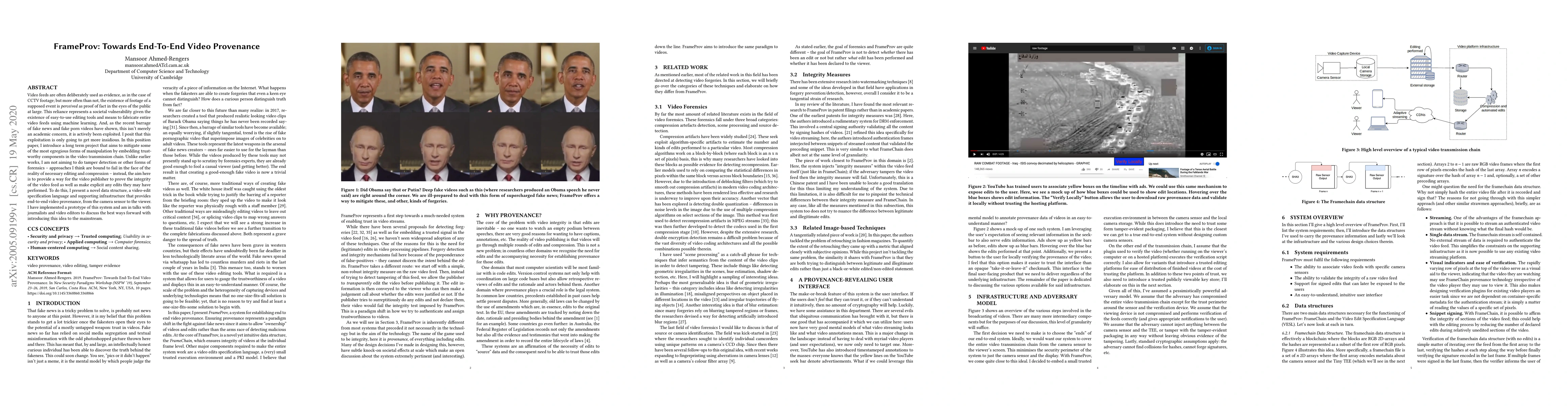 Video feeds are often deliberately used as evidence, as in the case of CCTV footage; but more often than not, the existence of footage of a supposed event is perceived as proof of fact in the eyes of the public at large. This reliance represents a societal vulnerability given the existence of easy-to-use editing tools and means to fabricate entire video feeds using machine learning. And, as the recent barrage of fake news and fake porn videos have shown, this isn't merely an academic concern, it is actively been exploited. I posit that this exploitation is only going to get more insidious. In this position paper, I introduce a long term project that aims to mitigate some of the most egregious forms of manipulation by embedding trustworthy components in the video transmission chain. Unlike earlier works, I am not aiming to do tamper detection or other forms of forensics -- approaches I think are bound to fail in the face of the reality of necessary editing and compression -- instead, the aim here is to provide a way for the video publisher to prove the integrity of the video feed as well as make explicit any edits they may have performed. To do this, I present a novel data structure, a video-edit specification language and supporting infrastructure that provides end-to-end video provenance, from the camera sensor to the viewer. I have implemented a prototype of this system and am in talks with journalists and video editors to discuss the best ways forward with introducing this idea to the mainstream.