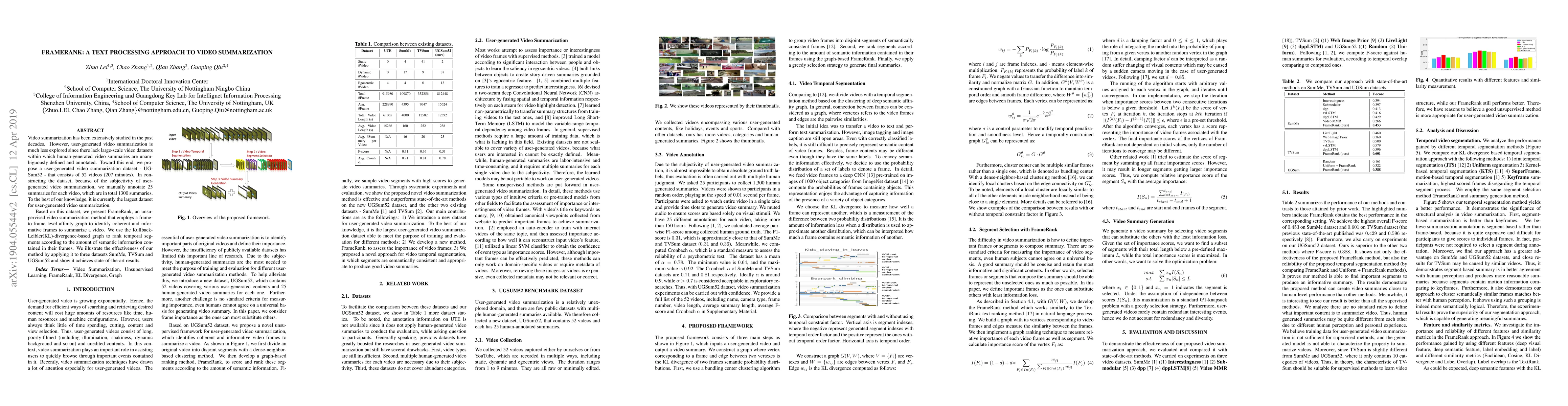 FrameRank is an unsupervised video summarization method that uses a frame-to-frame affinity graph to identify key frames, achieving state-of-the-art results on three datasets. The method is supported by UGSum52, a new large-scale dataset for user-generated video summarization, manually annotated with 1300 summaries.